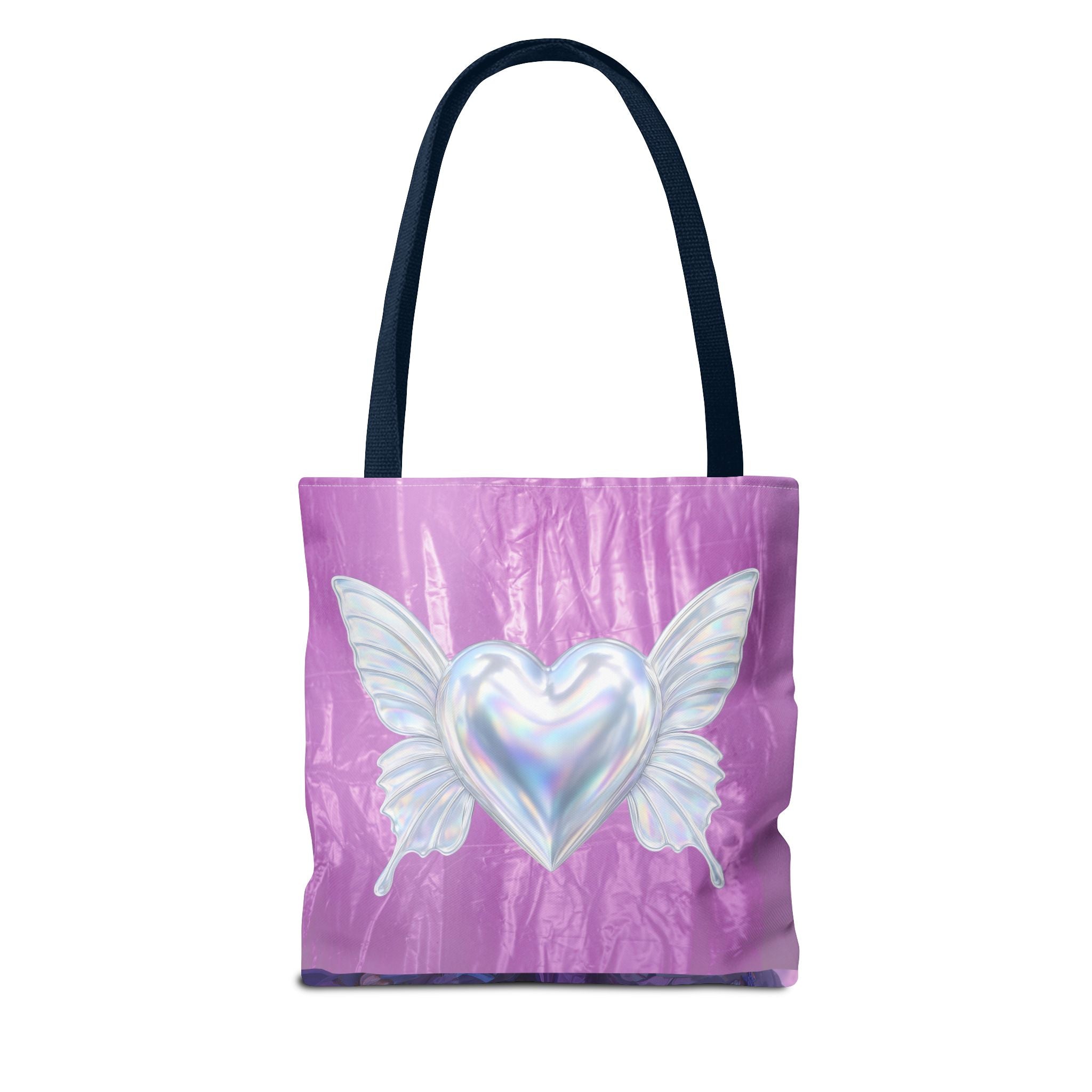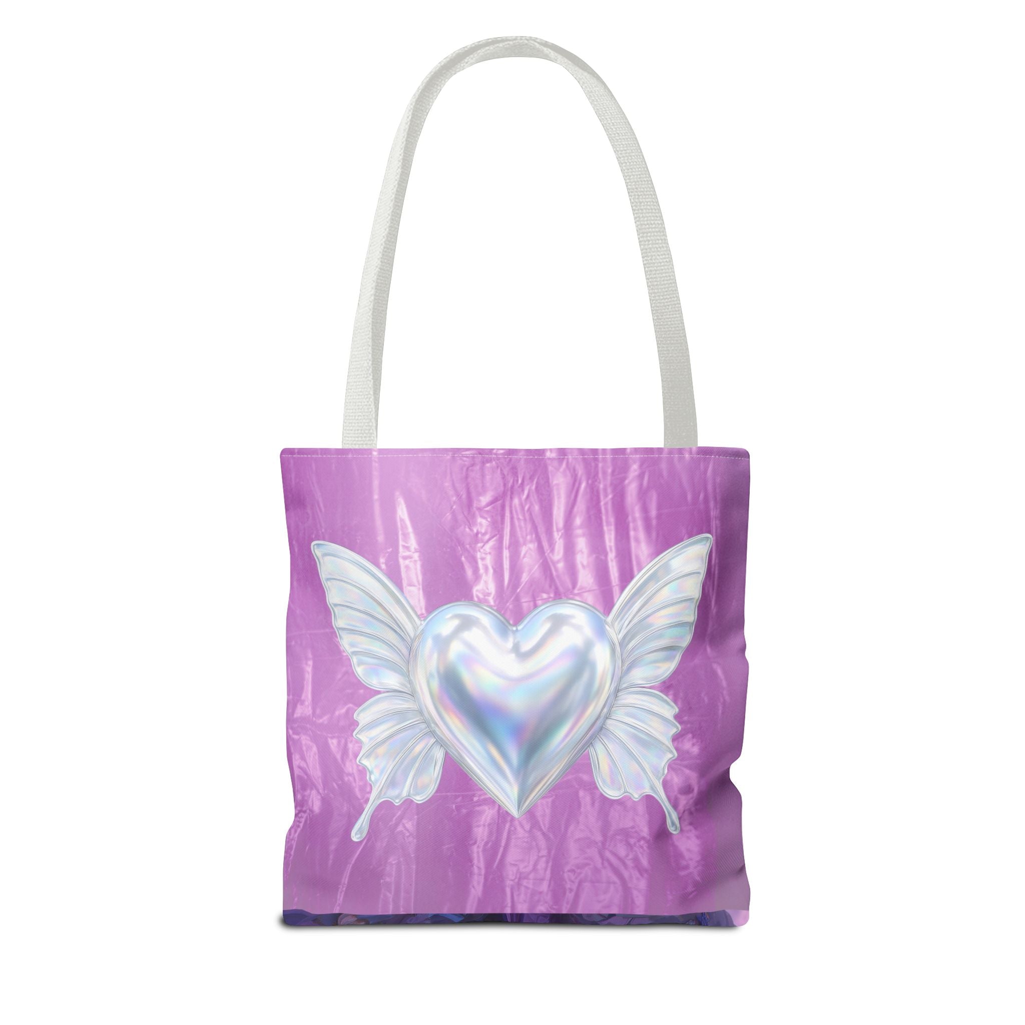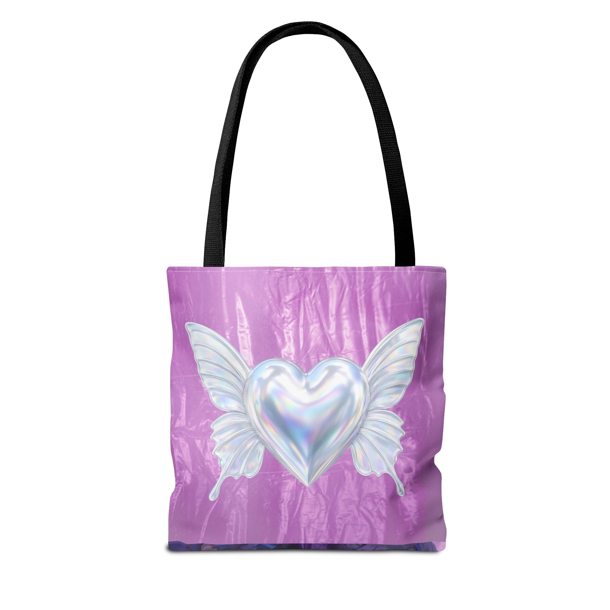For the ones who chase beauty even as it dissolves into code — this tote captures the heartbreak of digital dreams and the tenderness of a fading memory. Wrapped in vaporwave lilac and pixel hearts, it’s nostalgia rendered in polyester — fragile, glittering, and a little bit haunted.