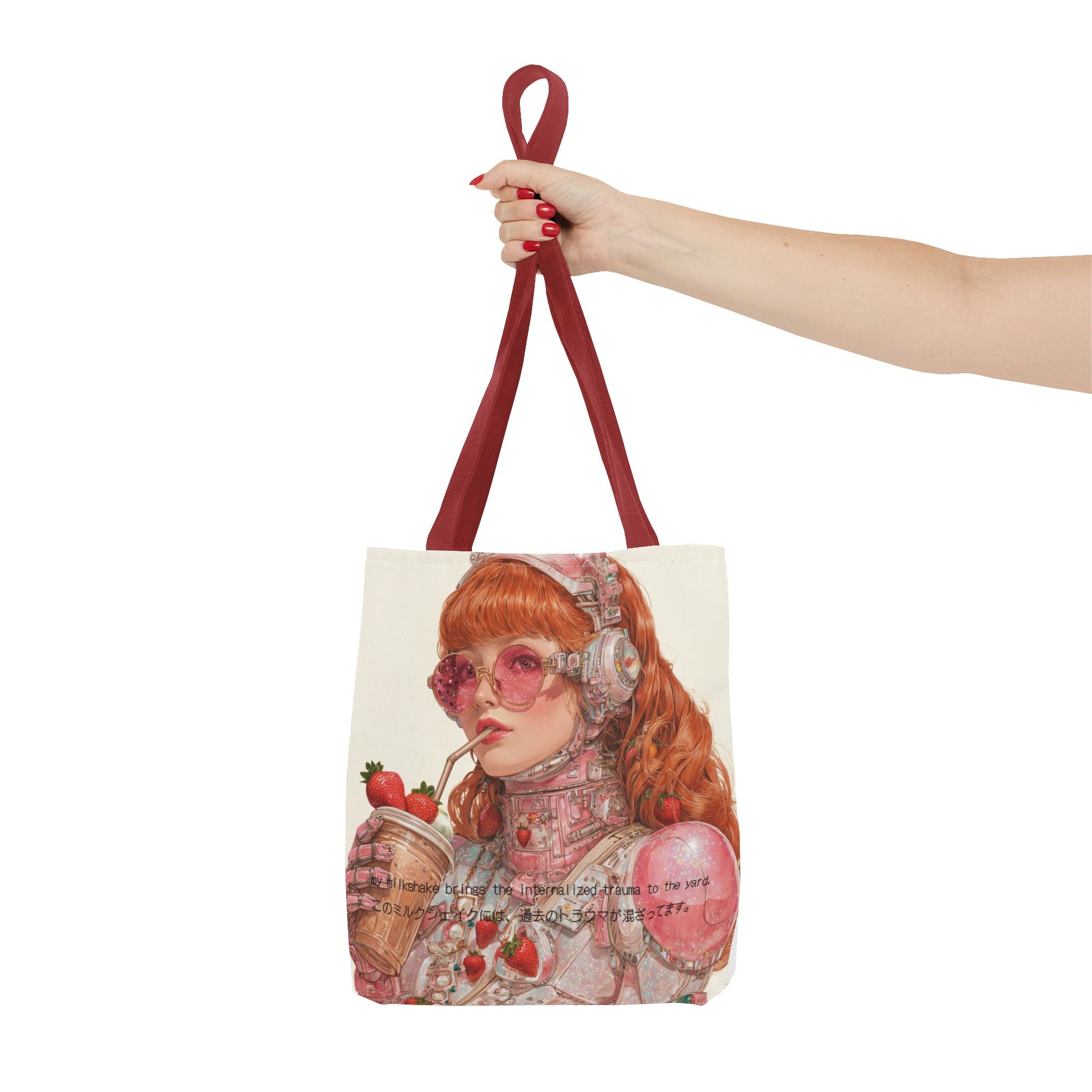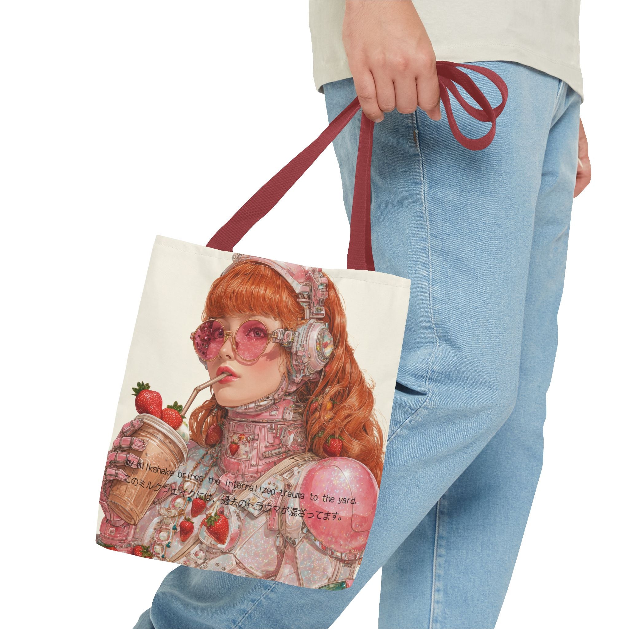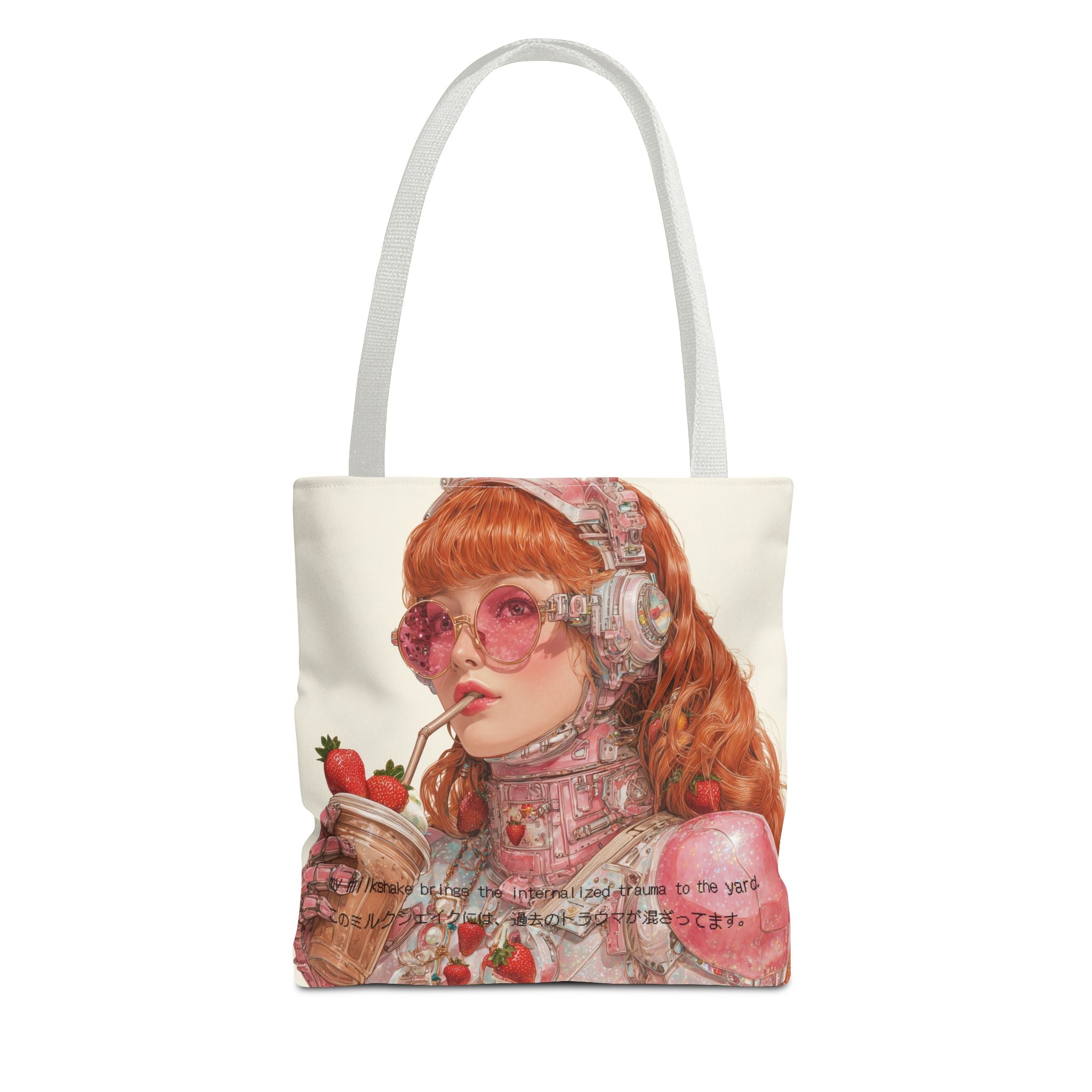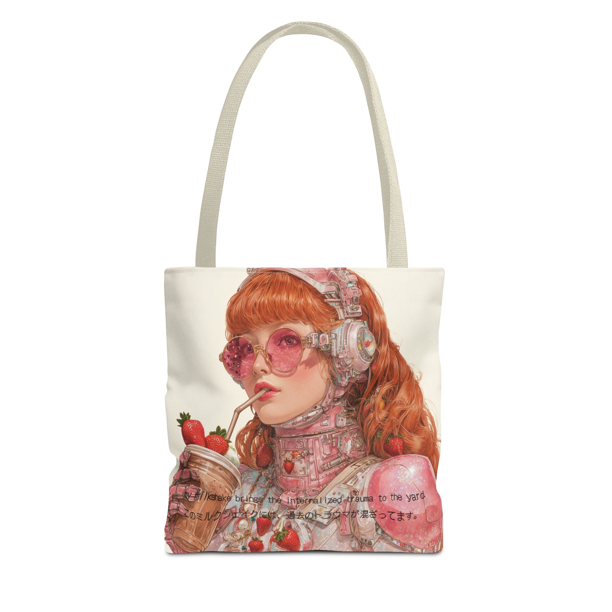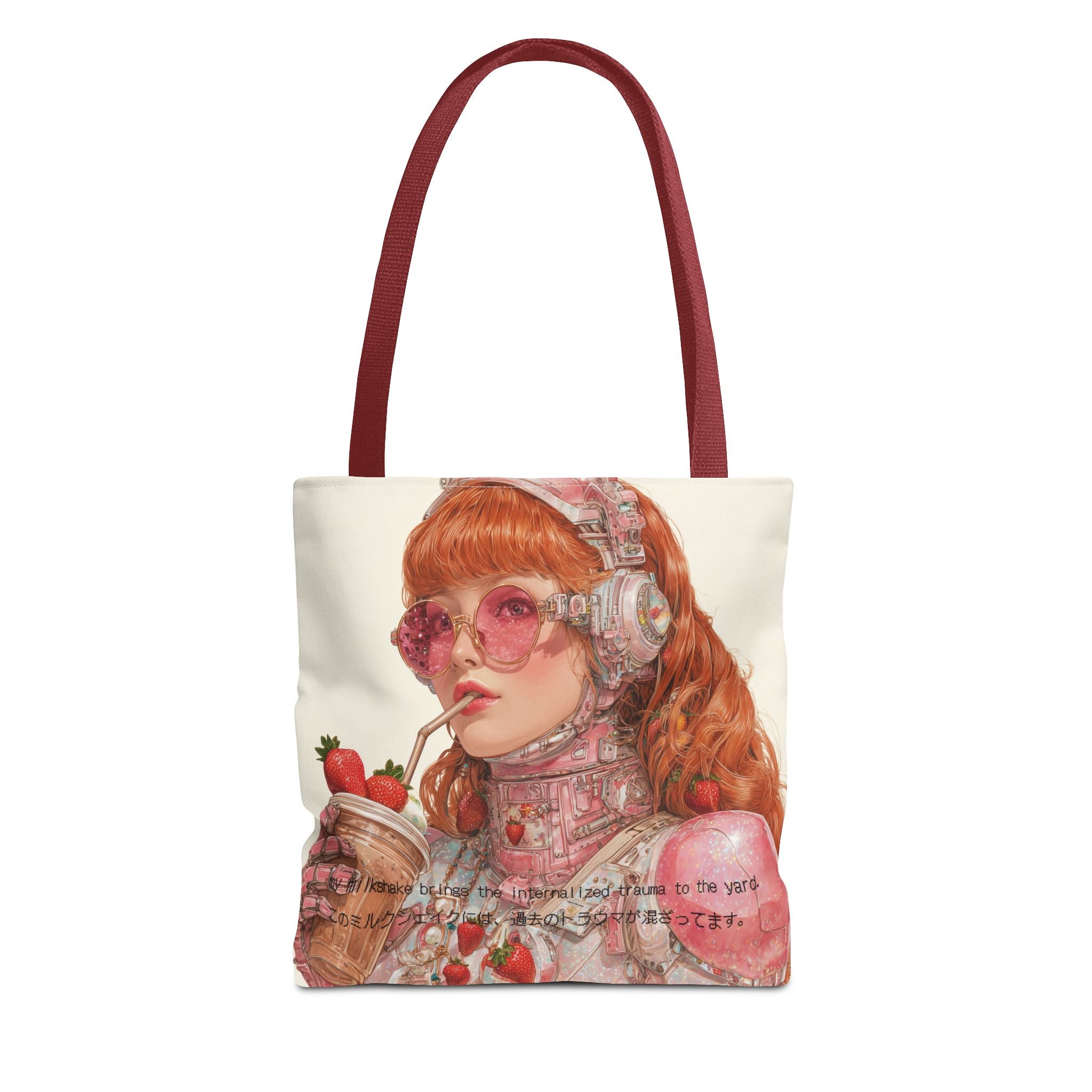 A wry ode to late-capitalist girlhood, this tote transforms self-awareness into an aesthetic ritual. Crafted for the beautifully unhinged — those who process heartbreak, history, and identity through irony and design — it merges cybernetic fantasy with soft rebellion. The strawberry tones evoke a fragile nostalgia, while the metallic undertones whisper of evolution: from flesh to chrome, from sentiment to survival.