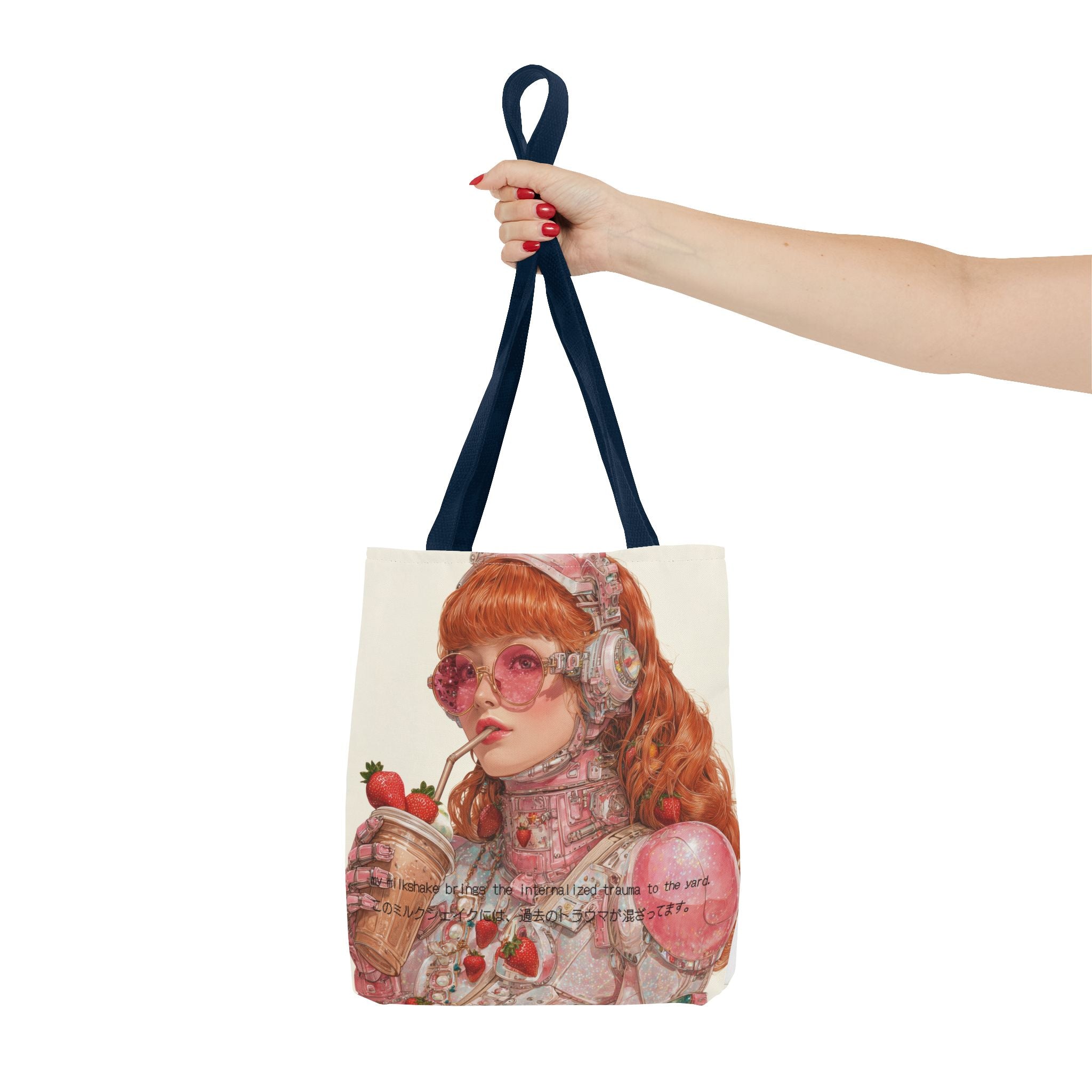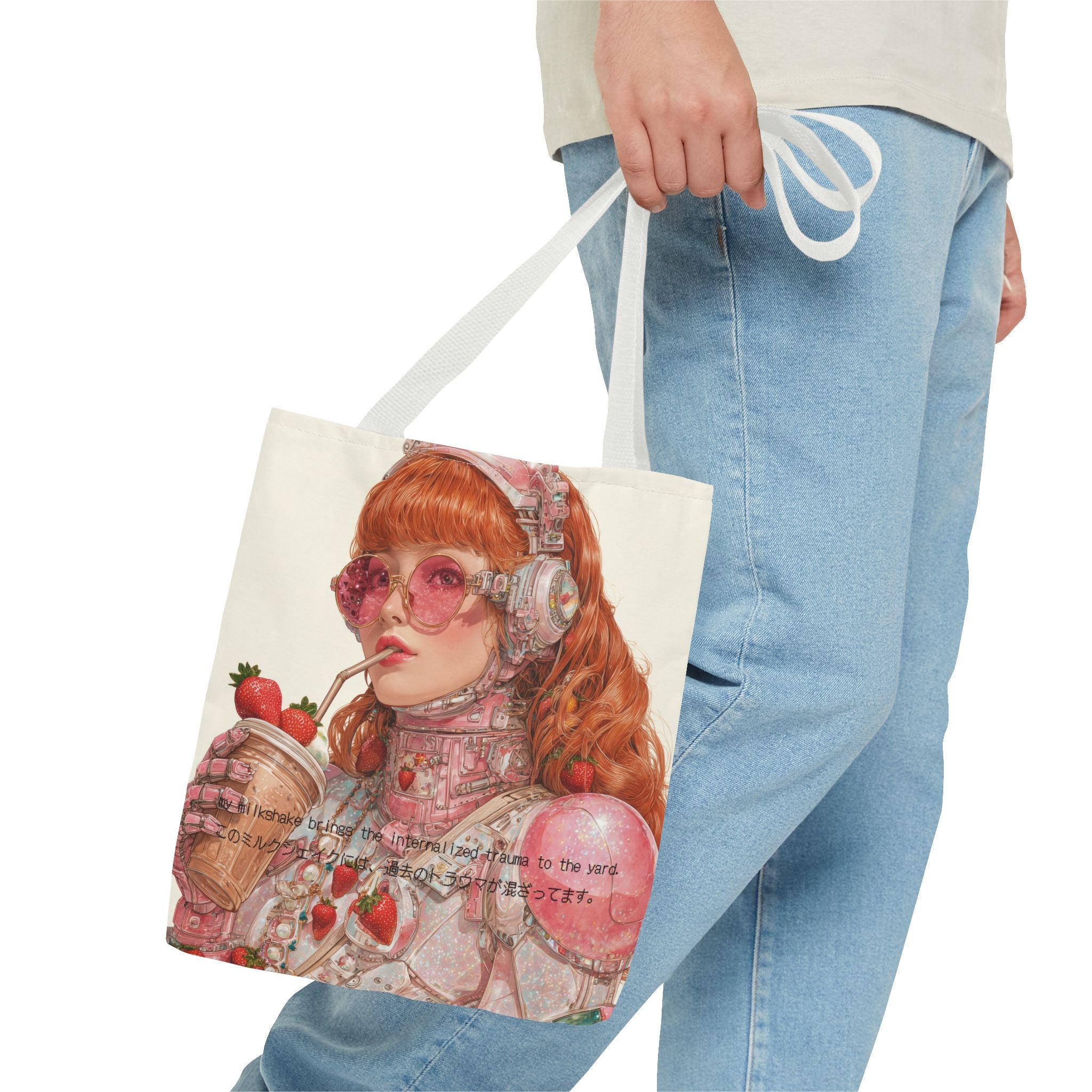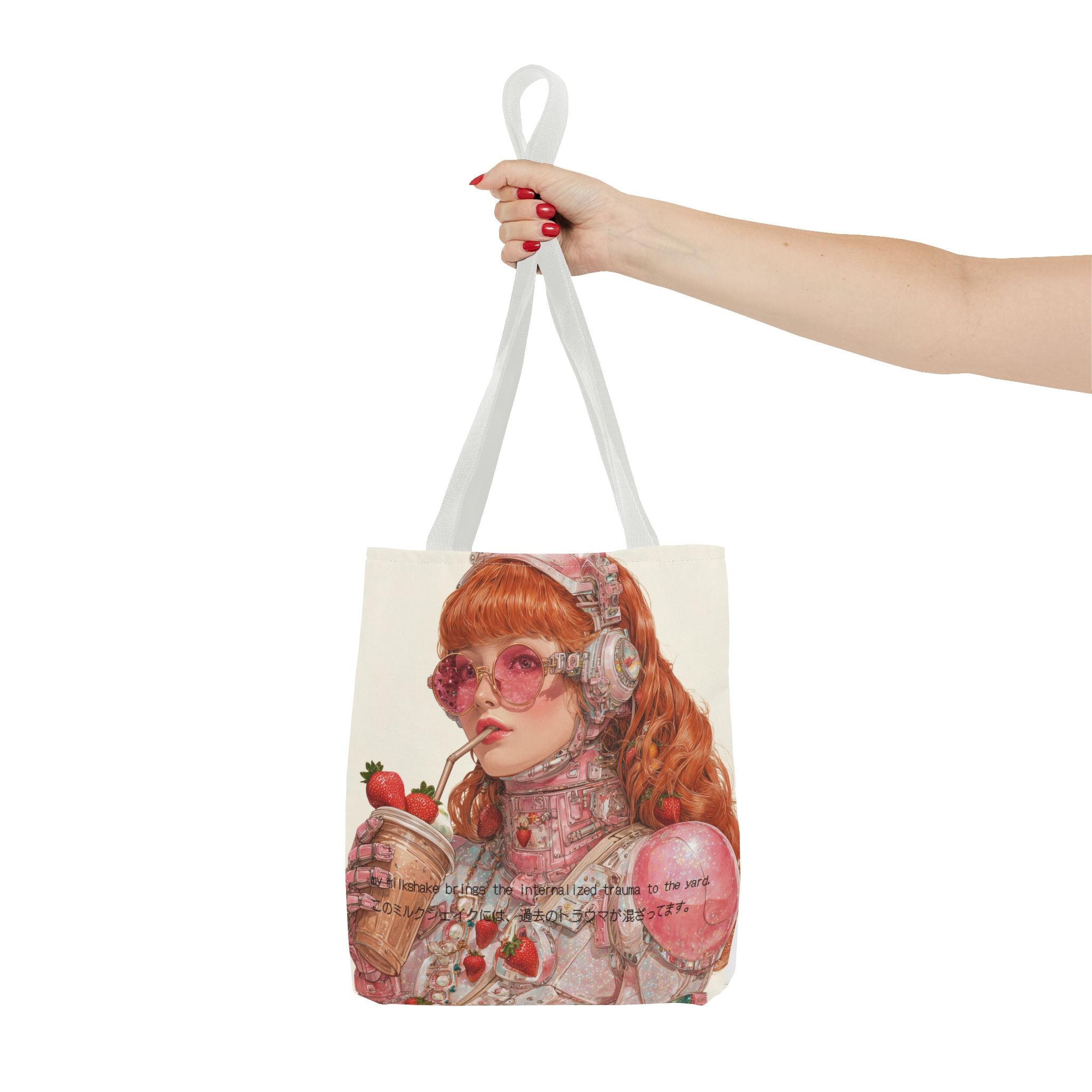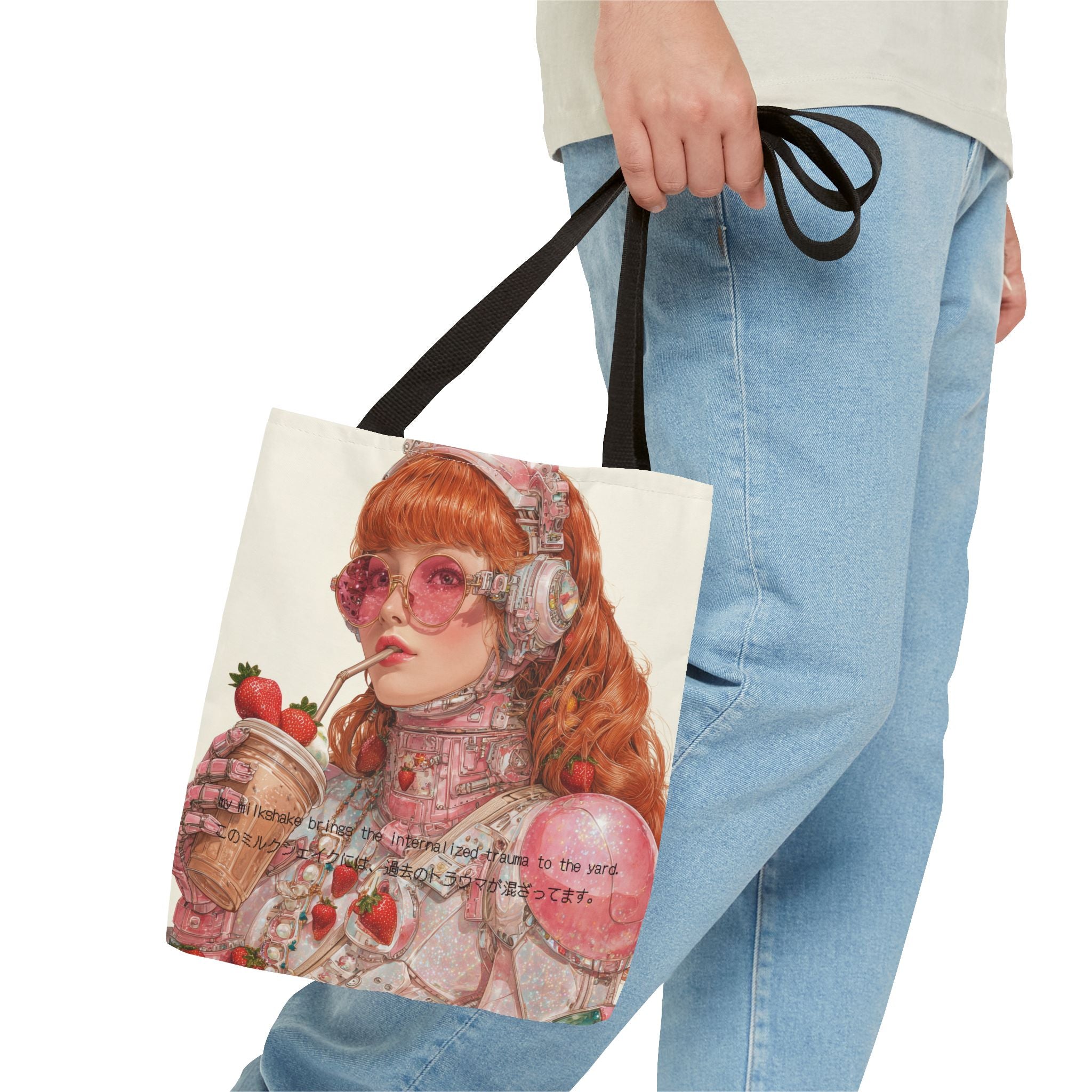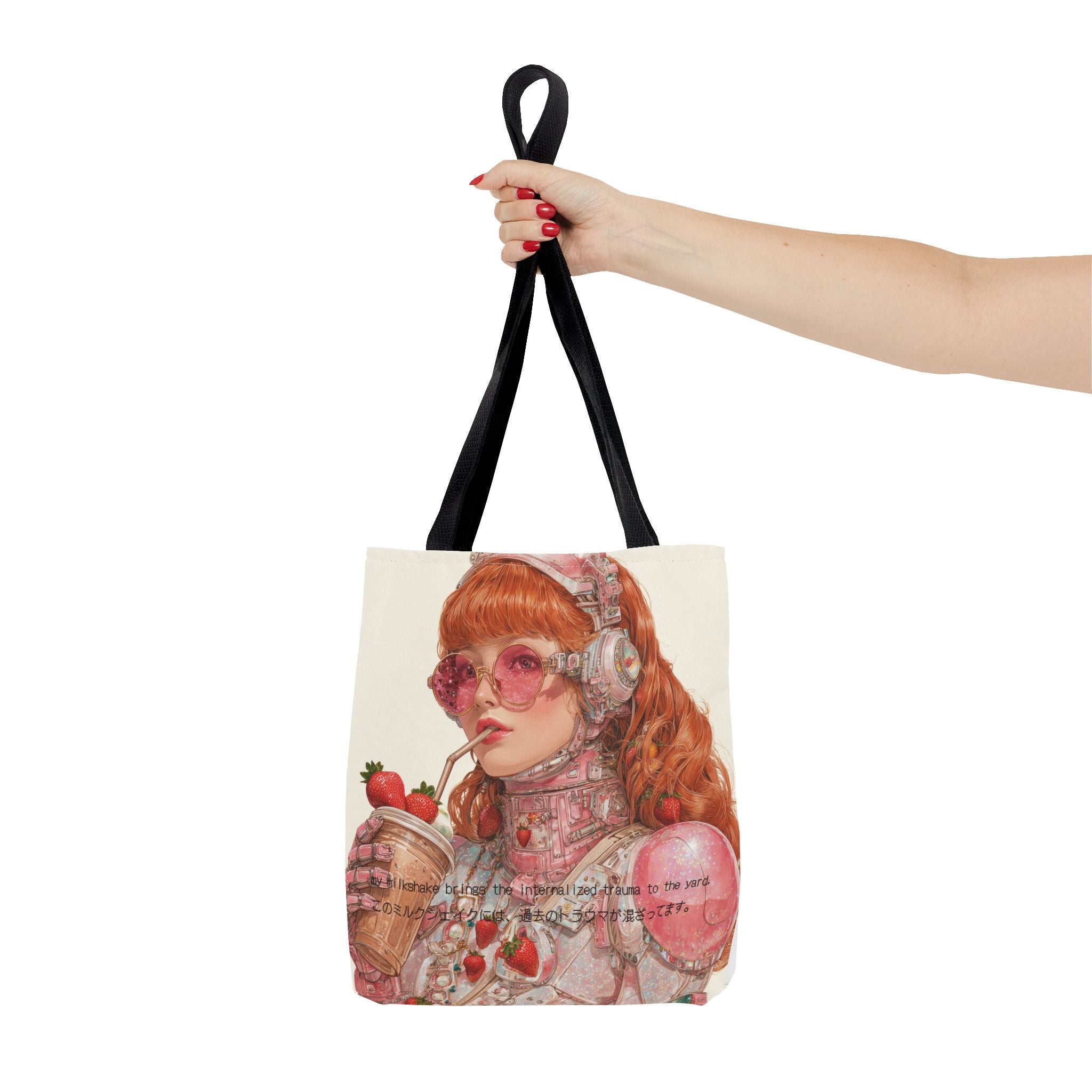 A wry ode to late-capitalist girlhood, this tote transforms self-awareness into an aesthetic ritual. Crafted for the beautifully unhinged — those who process heartbreak, history, and identity through irony and design — it merges cybernetic fantasy with soft rebellion. The strawberry tones evoke a fragile nostalgia, while the metallic undertones whisper of evolution: from flesh to chrome, from sentiment to survival.