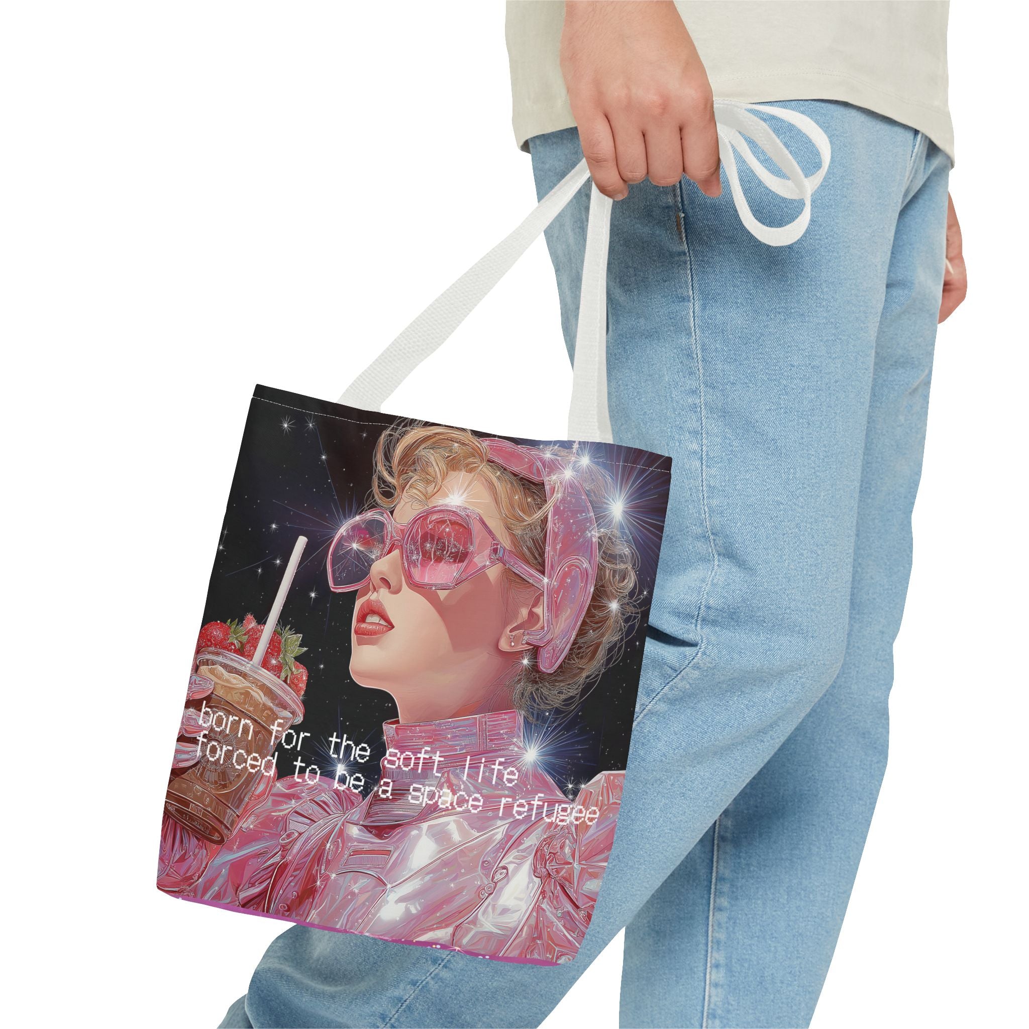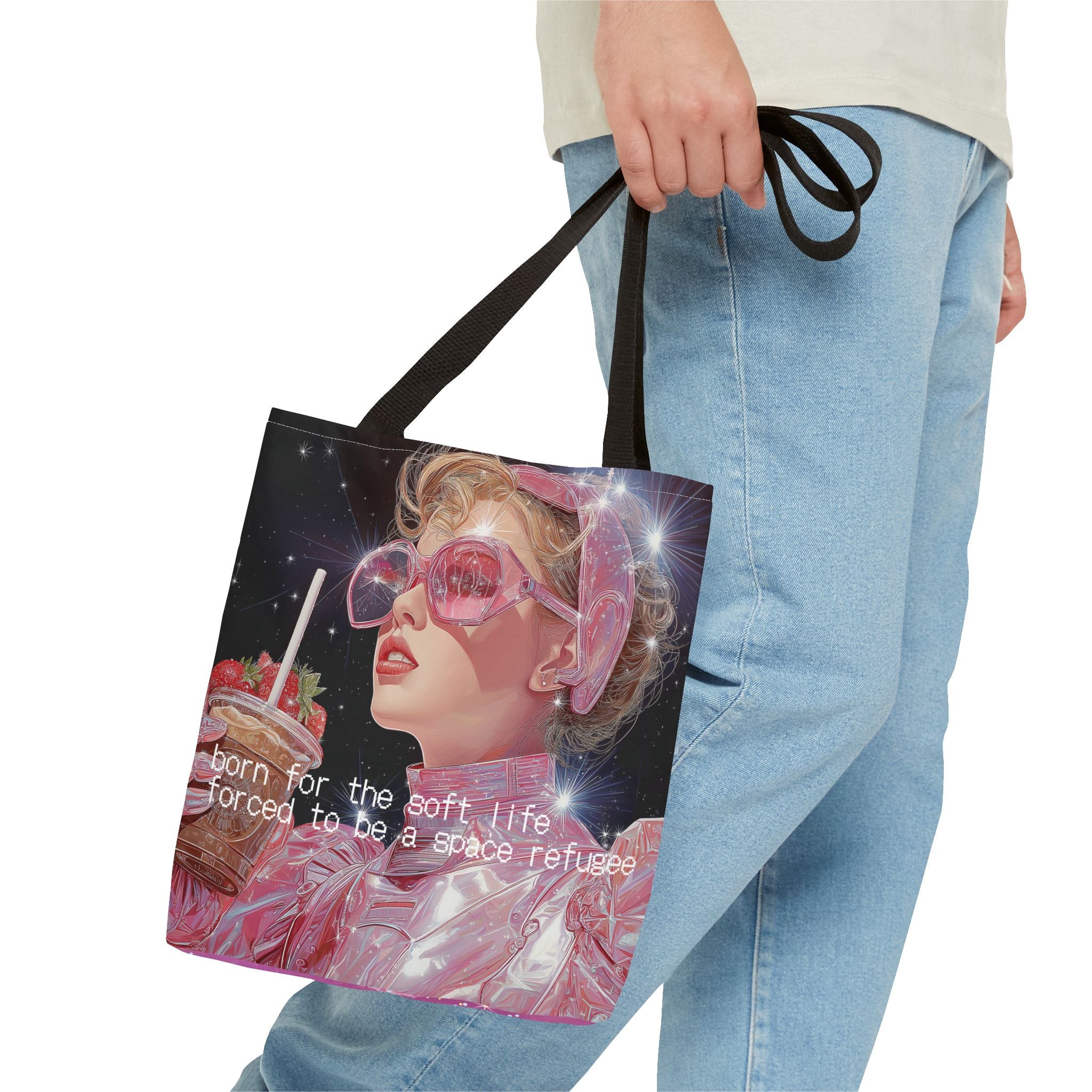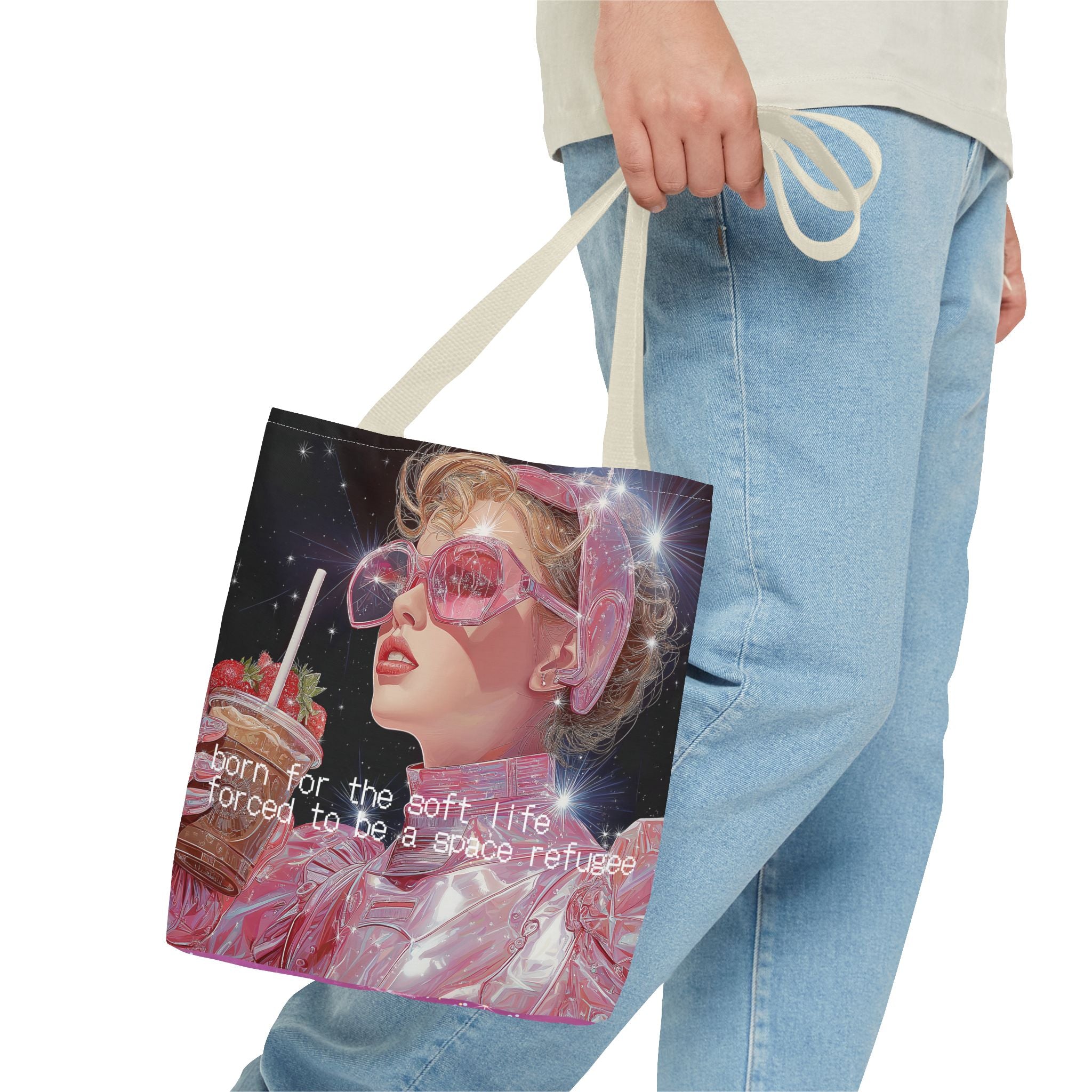 Born for the soft life, forced to be a space refugee — this tote captures the bittersweet poetry of existing in a world that’s both beautiful and collapsing. A love letter to the modern dreamer: iridescent, caffeinated, and slightly disillusioned. Perfect for coffee runs, cosmic errands, or escaping Earth in style.