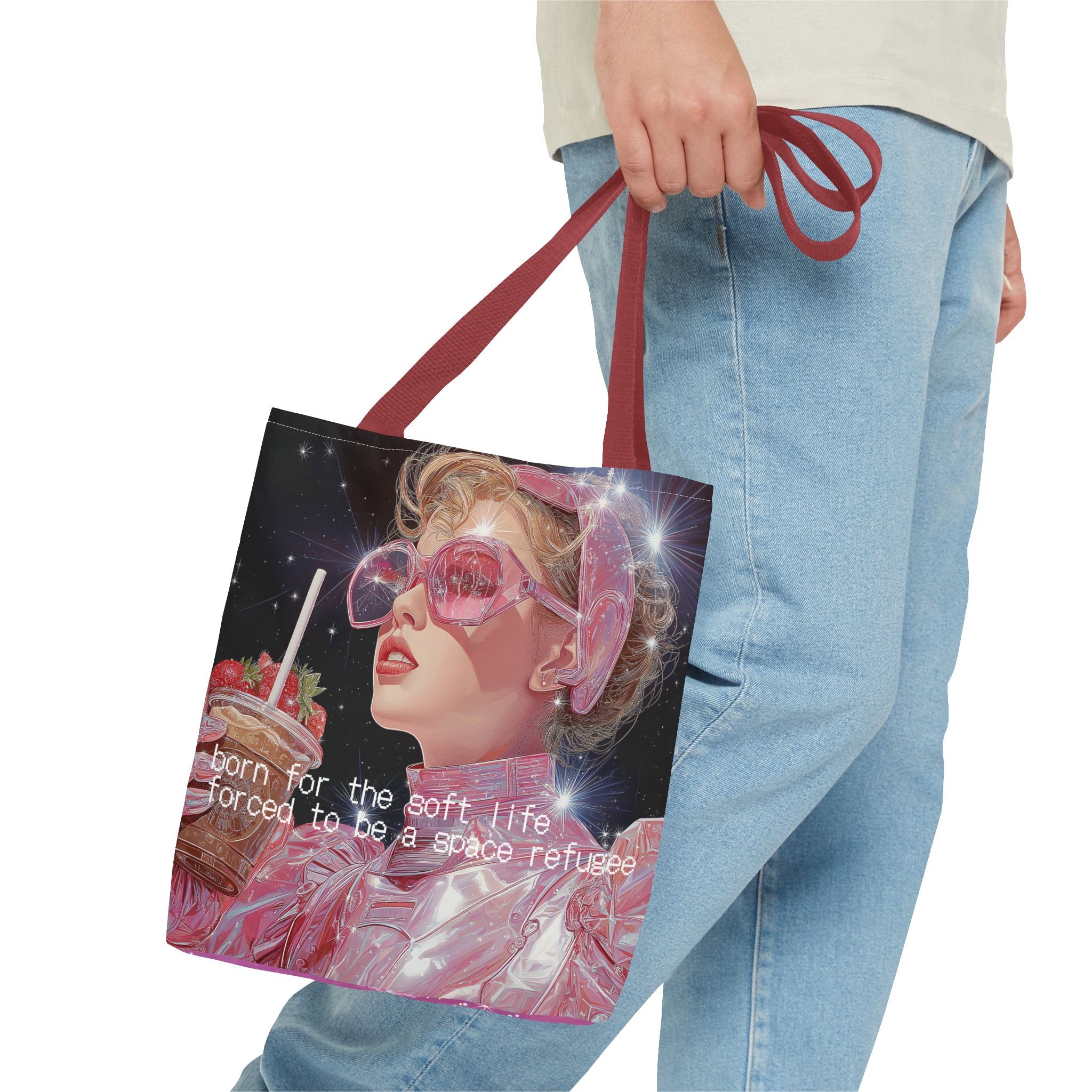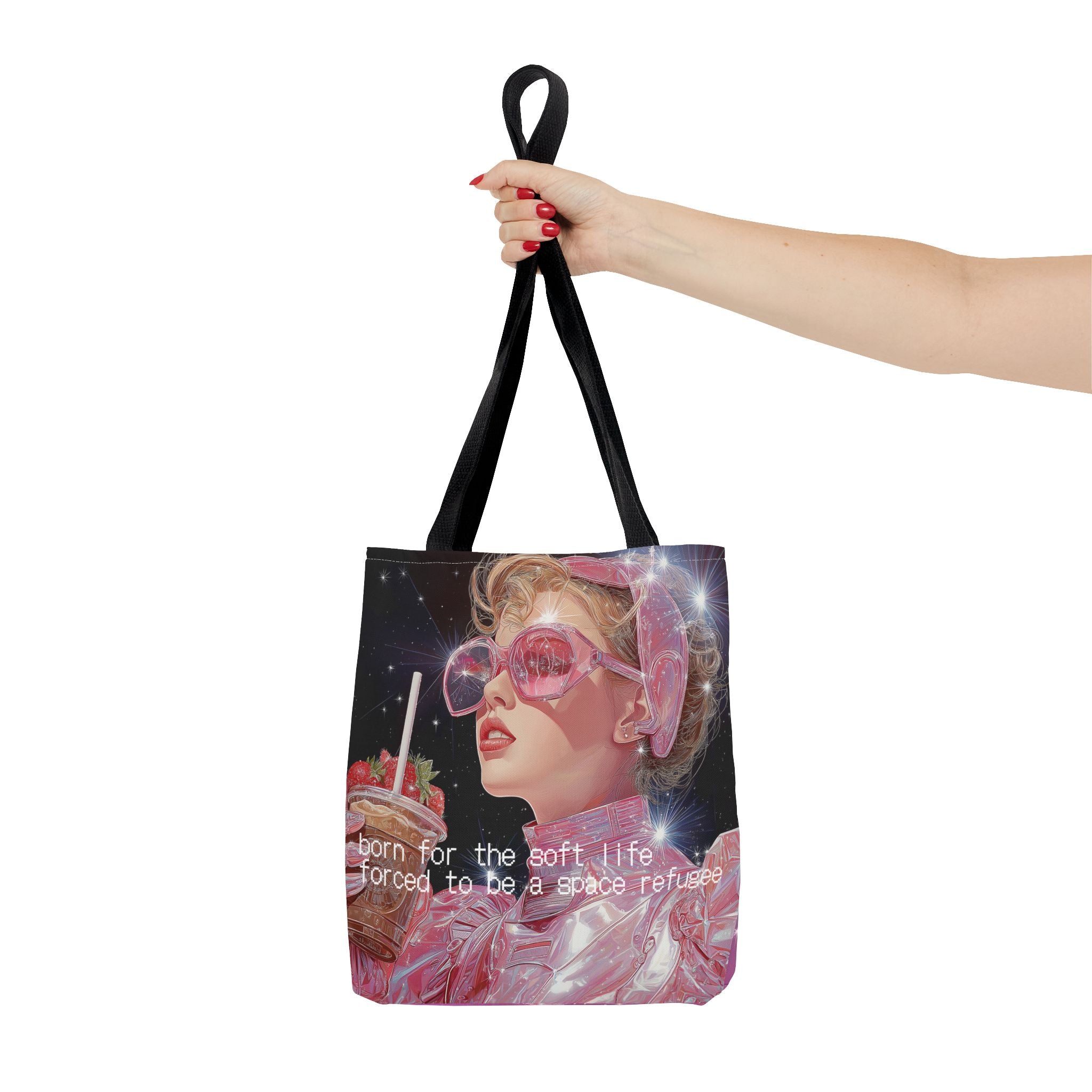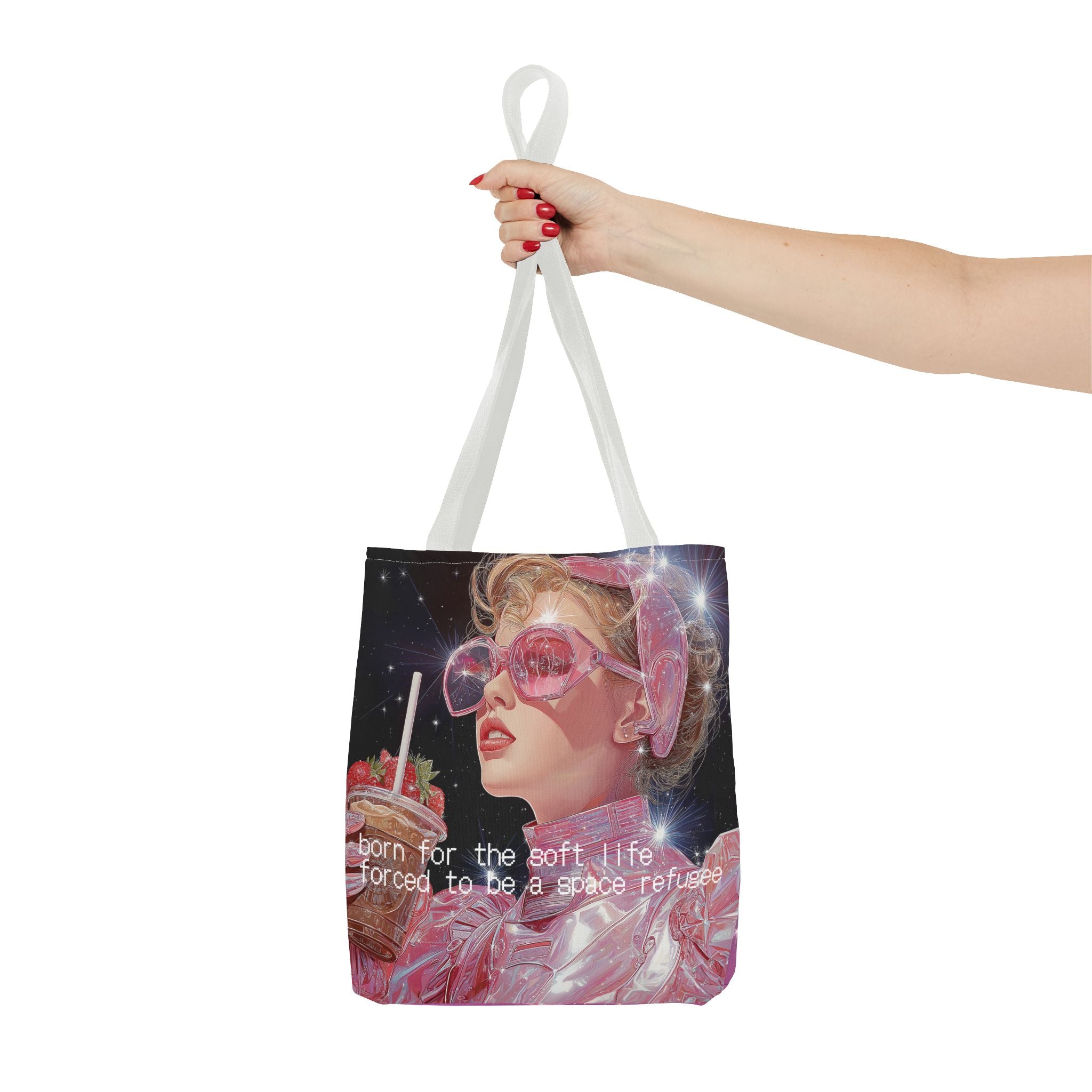 Born for the soft life, forced to be a space refugee — this tote captures the bittersweet poetry of existing in a world that’s both beautiful and collapsing. A love letter to the modern dreamer: iridescent, caffeinated, and slightly disillusioned. Perfect for coffee runs, cosmic errands, or escaping Earth in style.