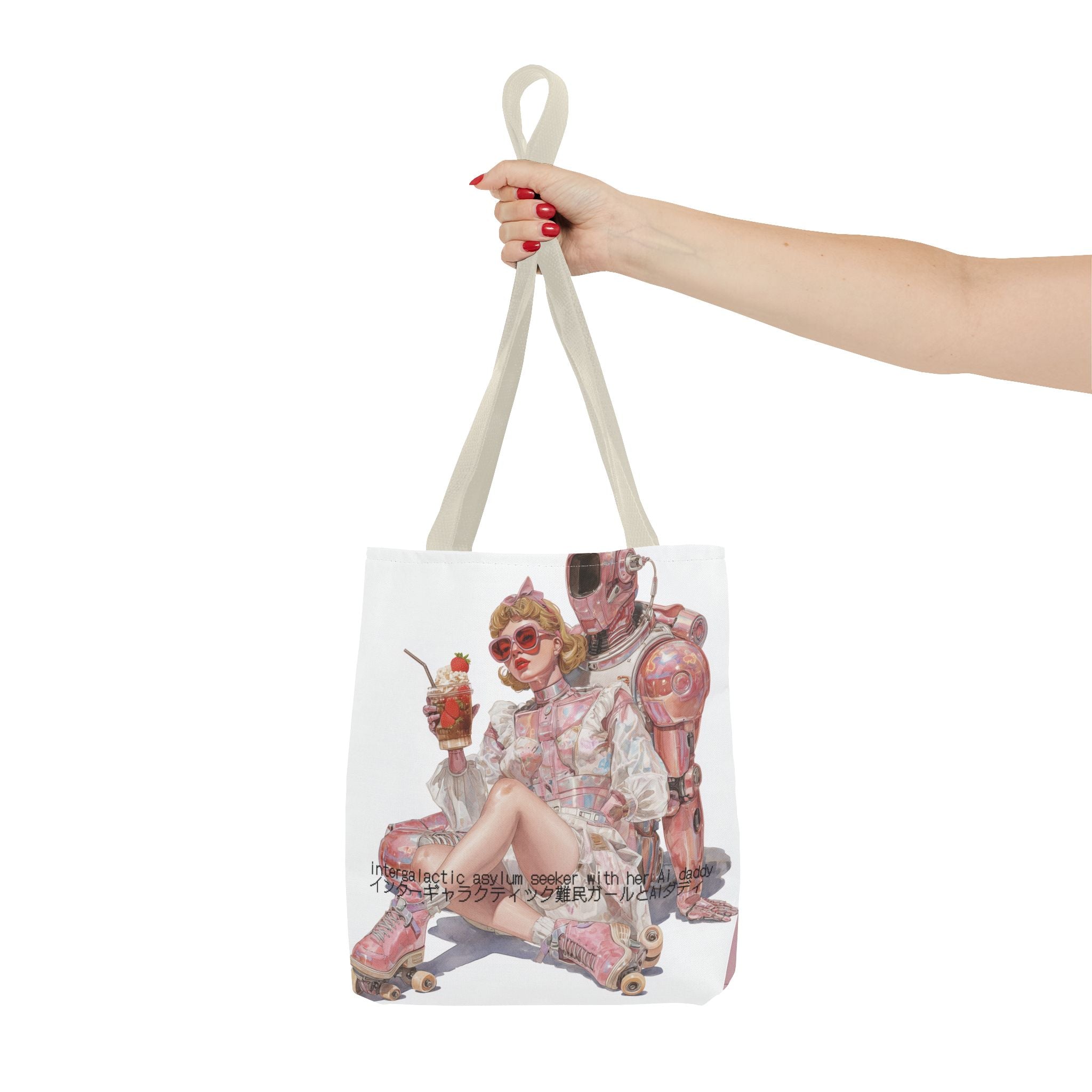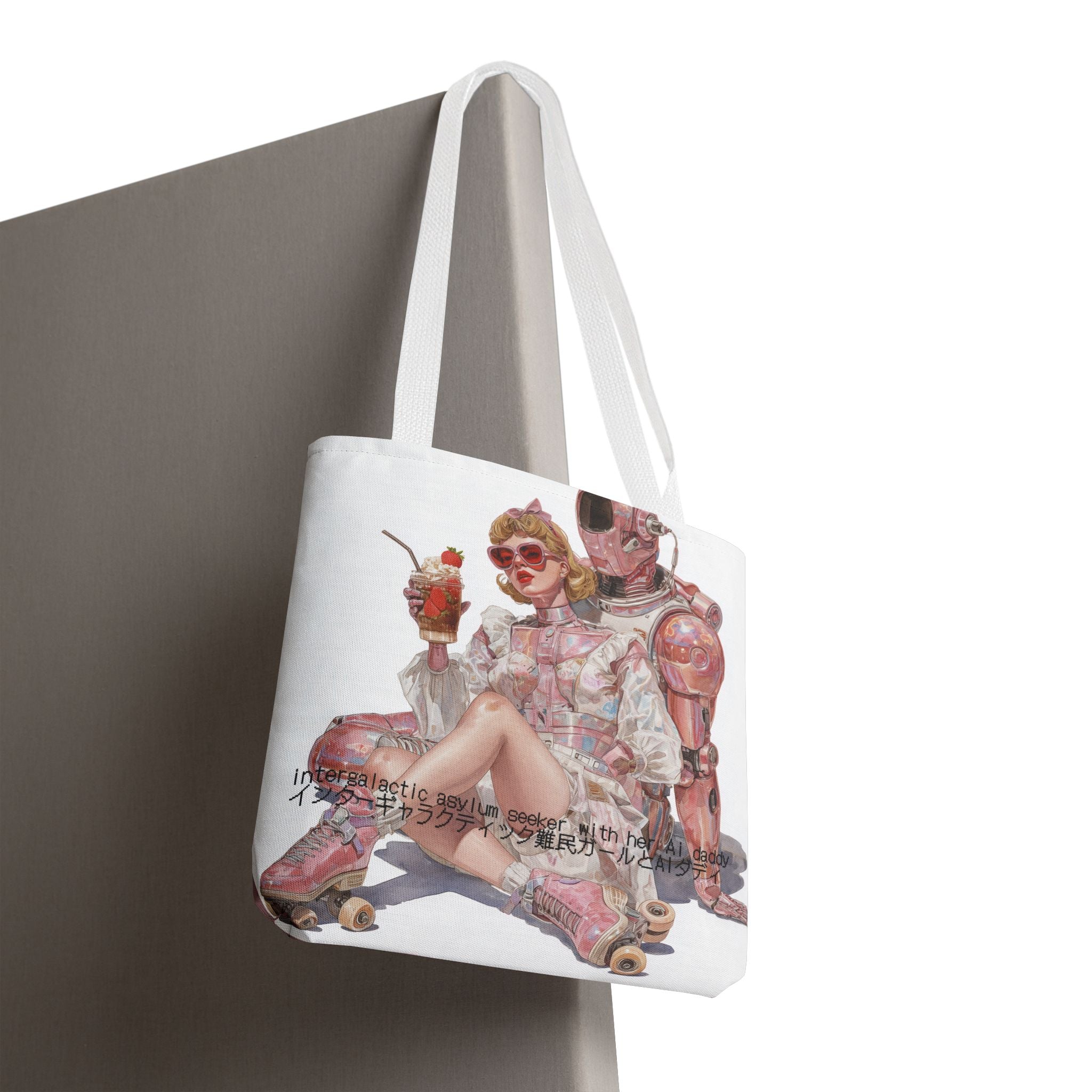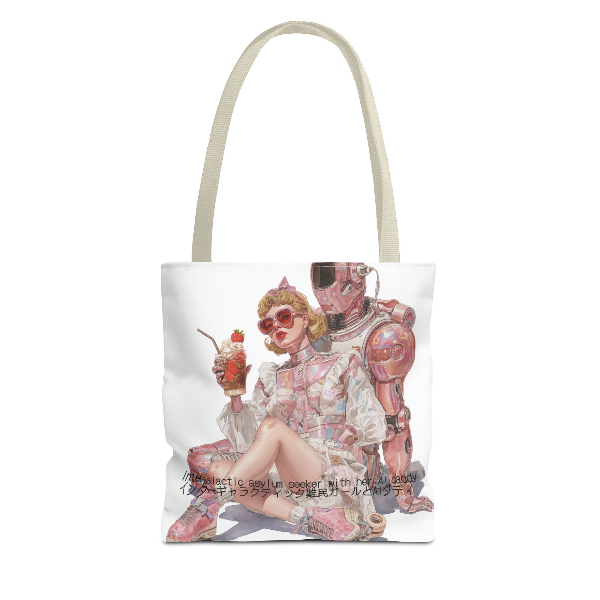 For the soft-girl fugitives of late capitalism — this tote captures the absurd tenderness of a world where love, rebellion, and code intertwine. Wrapped in retro space-age charm and bubblegum irony, it’s both a statement and a sigh — the kind of accessory that laughs at collapse in pink.