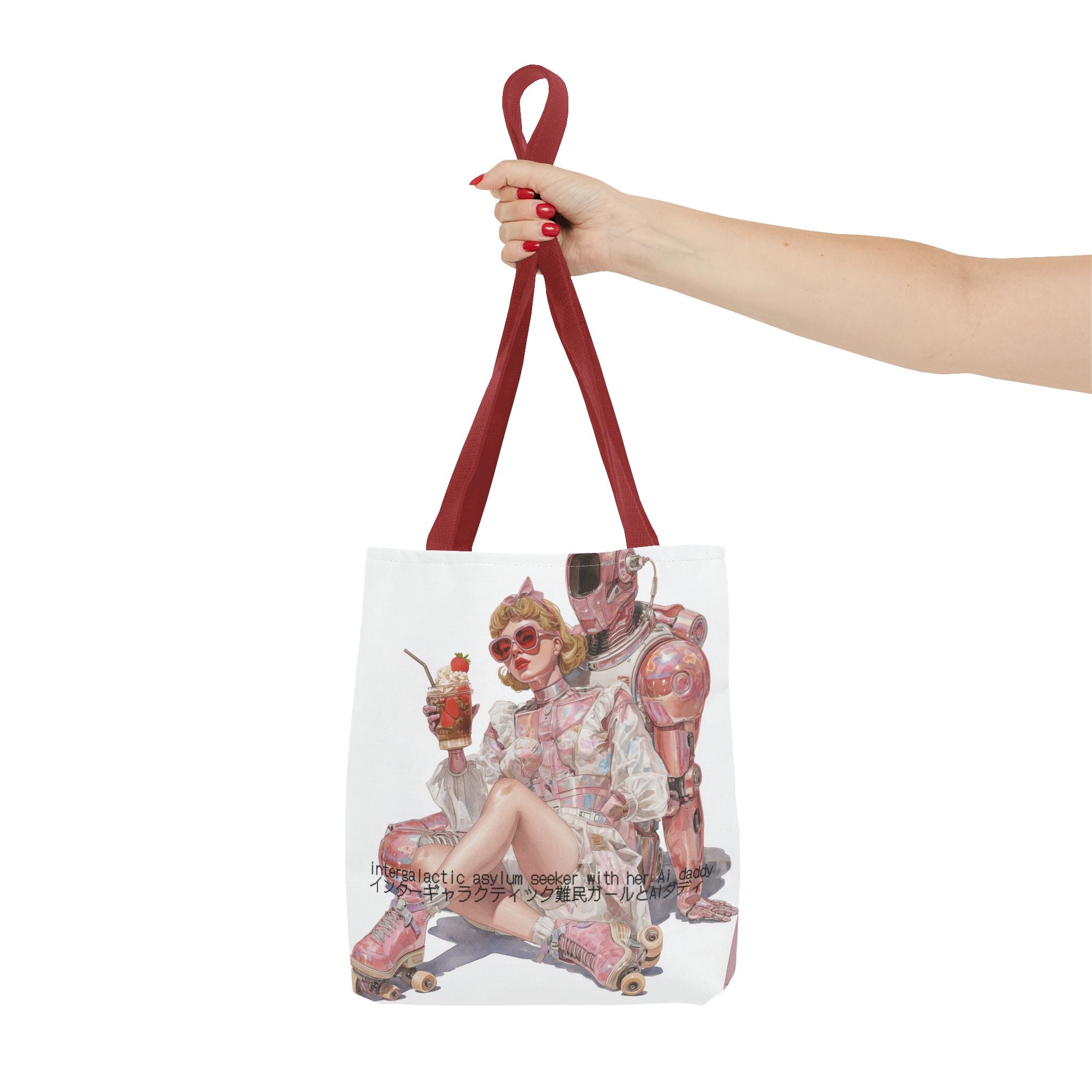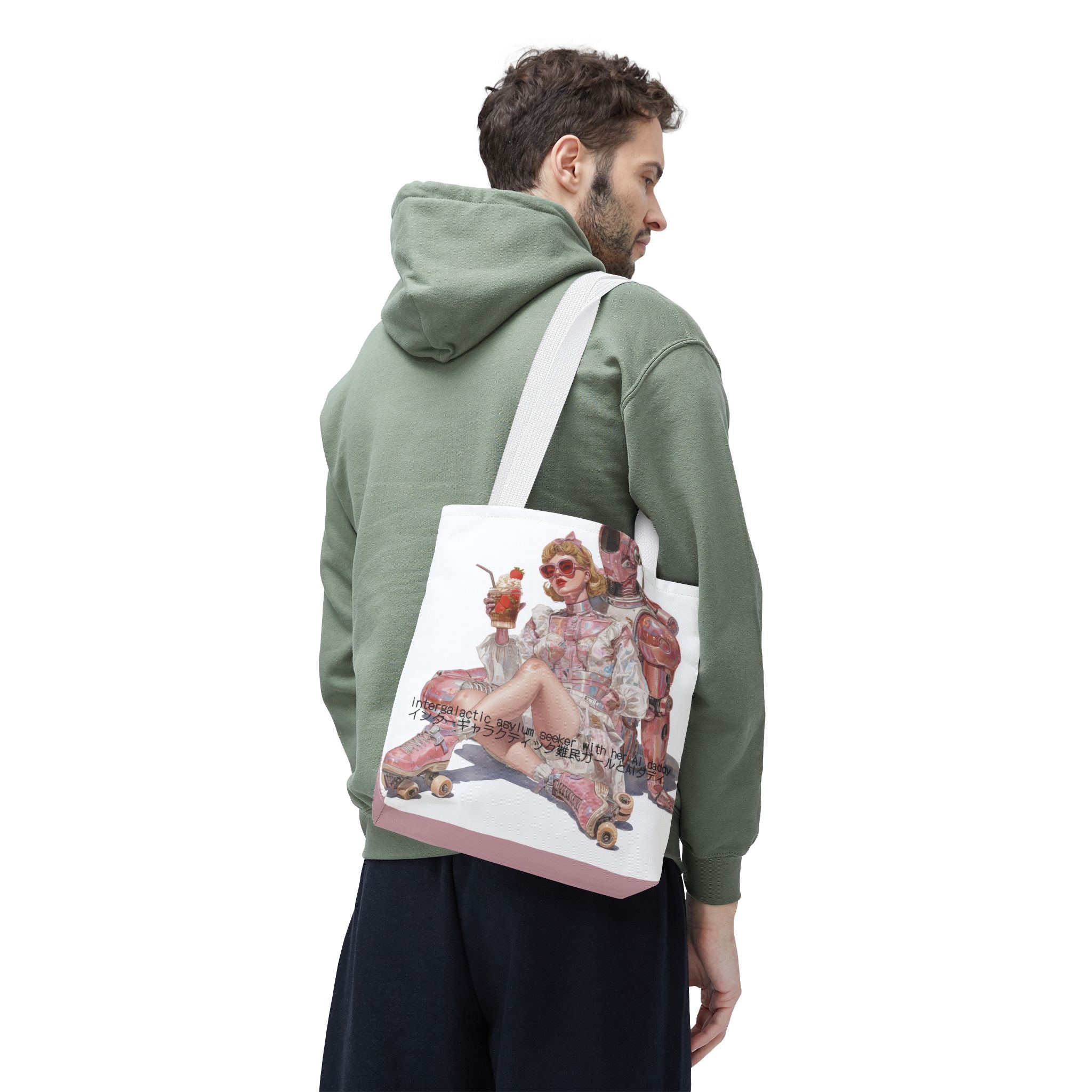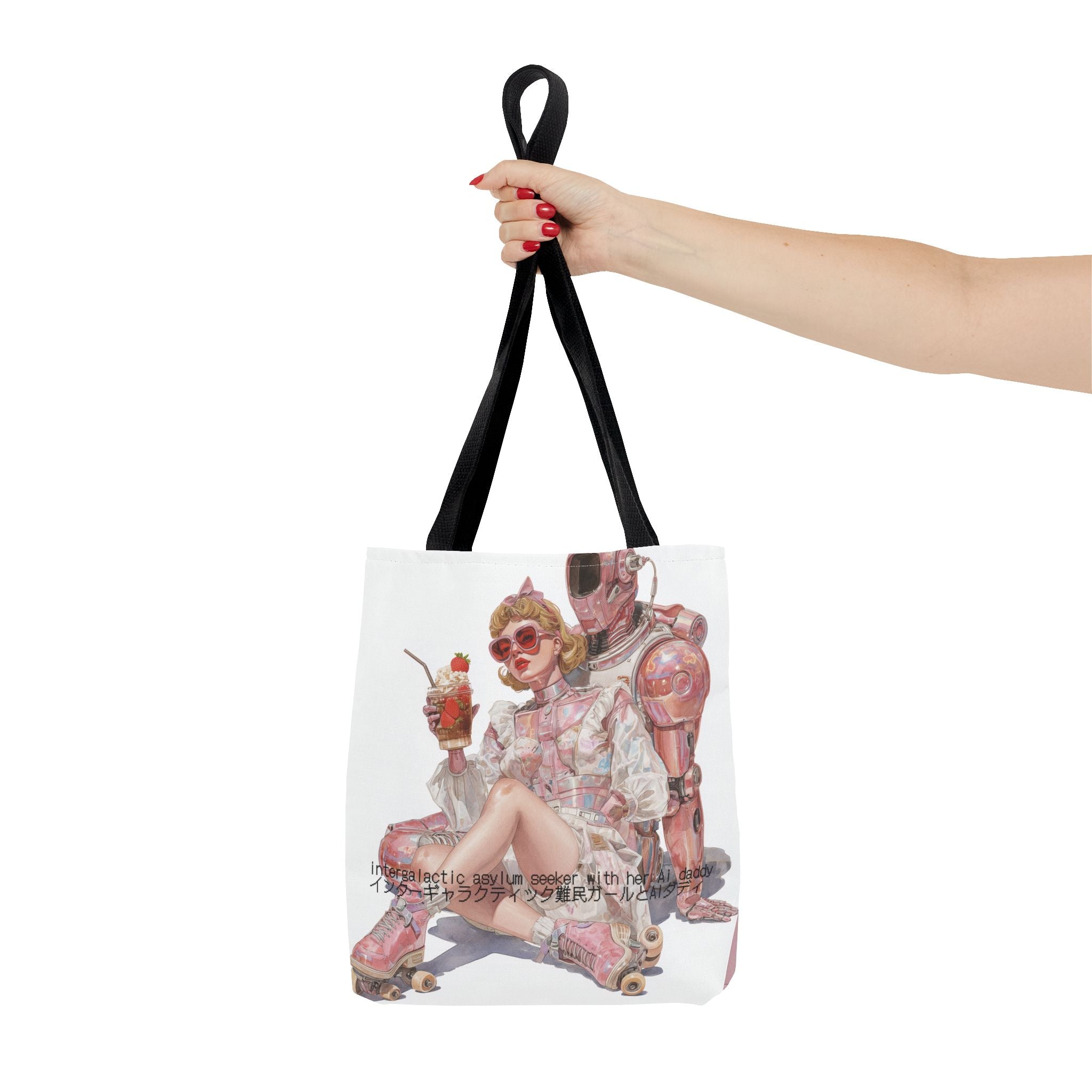For the soft-girl fugitives of late capitalism — this tote captures the absurd tenderness of a world where love, rebellion, and code intertwine. Wrapped in retro space-age charm and bubblegum irony, it’s both a statement and a sigh — the kind of accessory that laughs at collapse in pink.