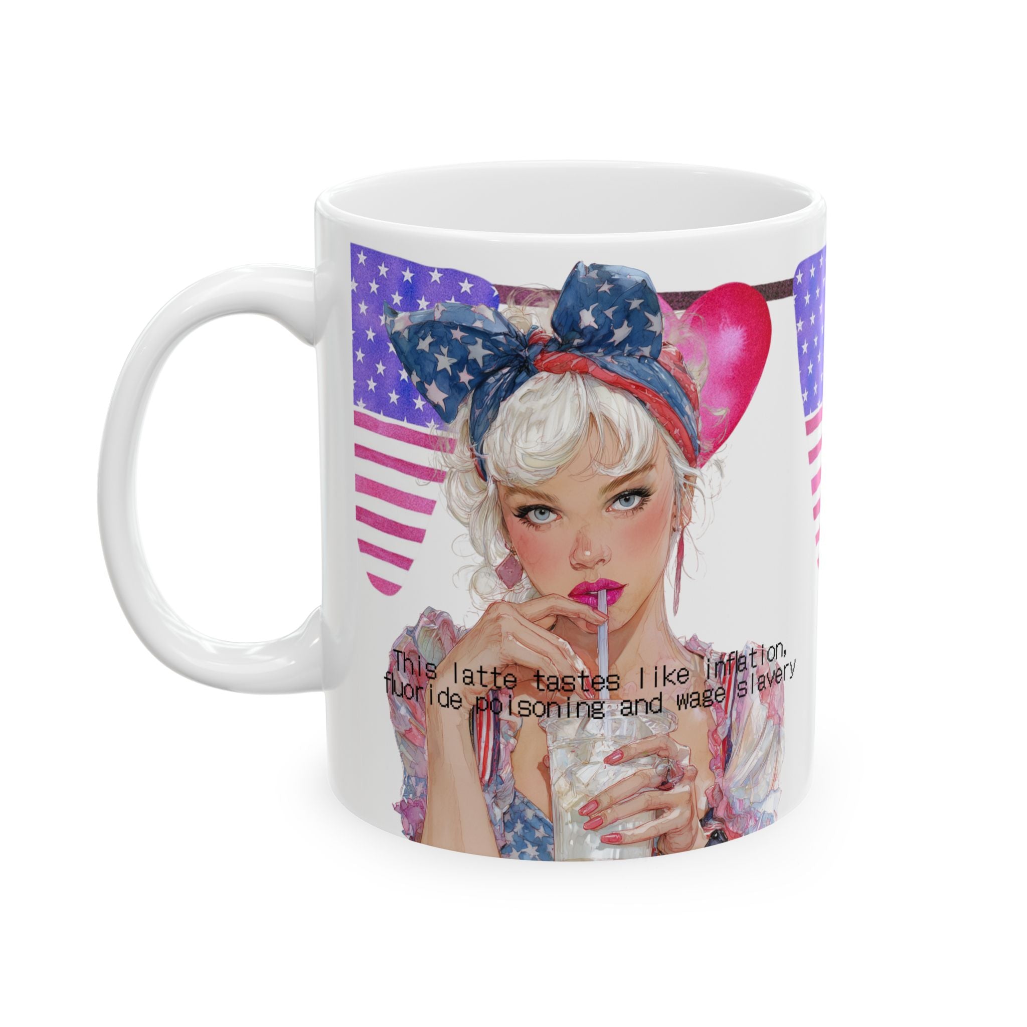 The Americana pin-up smiles as she drinks her sugar foam — the poster child of empire, drowning in debt, pretending the milk froth masks the rot. Camp. Kitsch. Collapse.