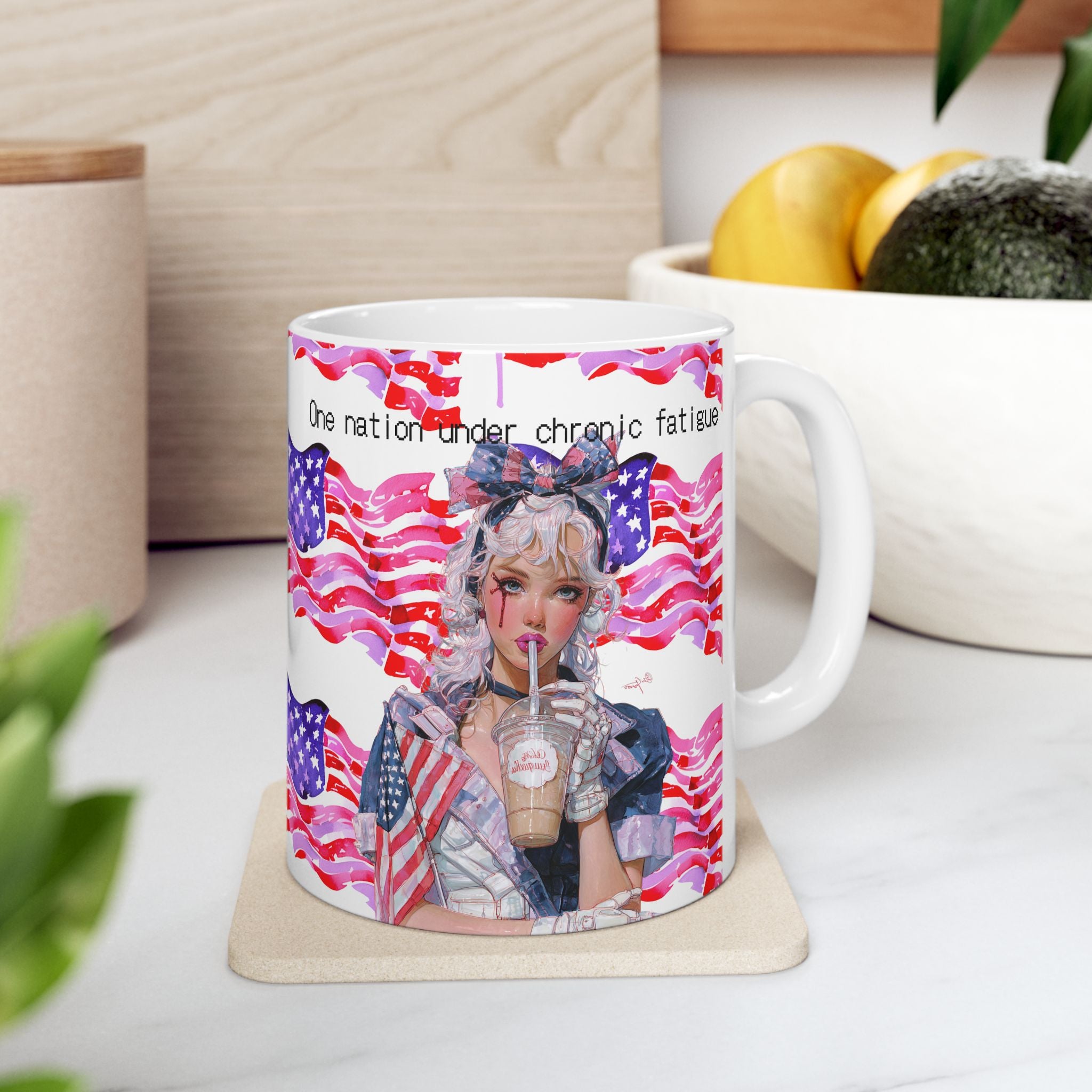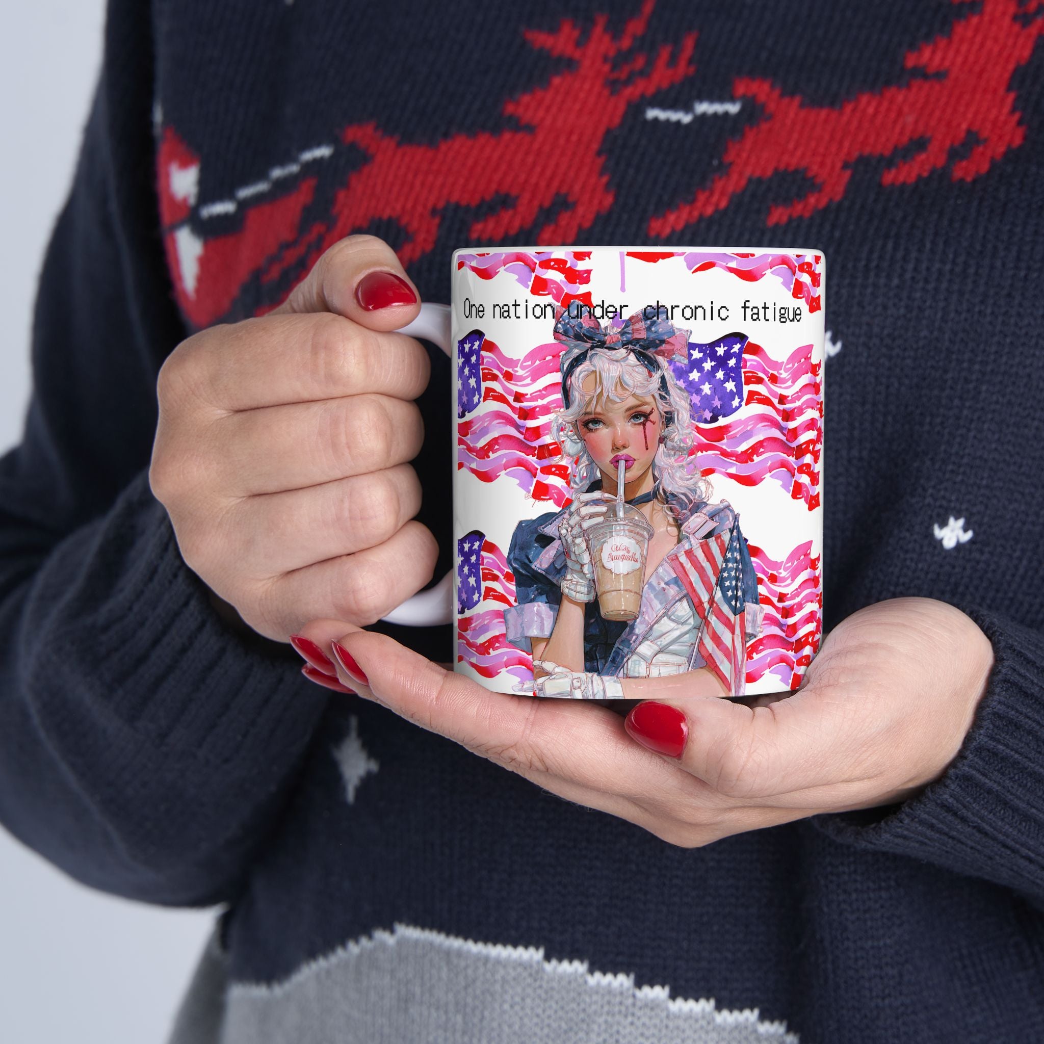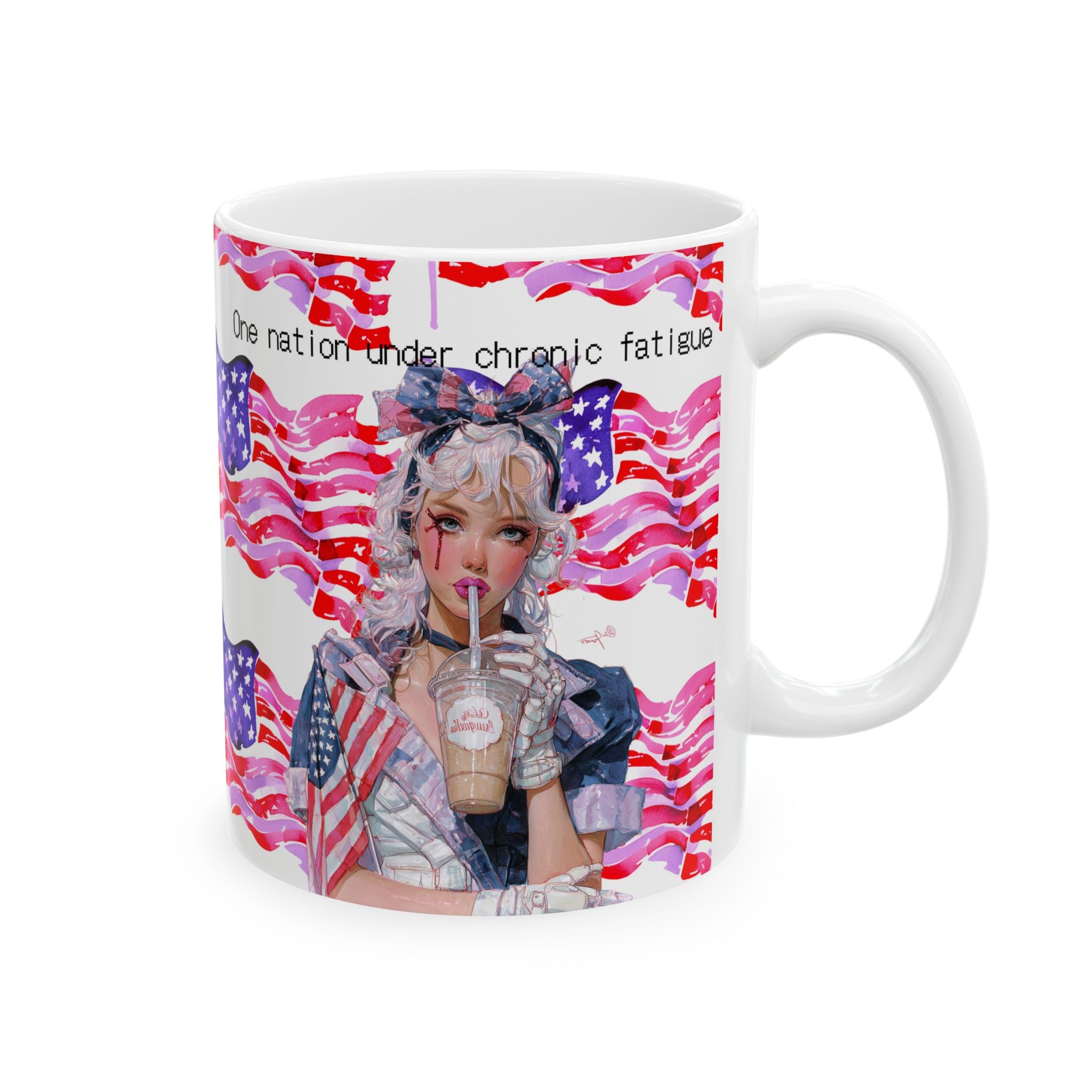 This mug is a hymn for the overworked, the under-slept, the chronically fatigued human machines powering a system that rewards exhaustion with… more exhaustion. Draped in pixelated flags, it’s equal parts satire and mirror: the American Dream served on ice, caffeine-dependent and mascara-smudged.