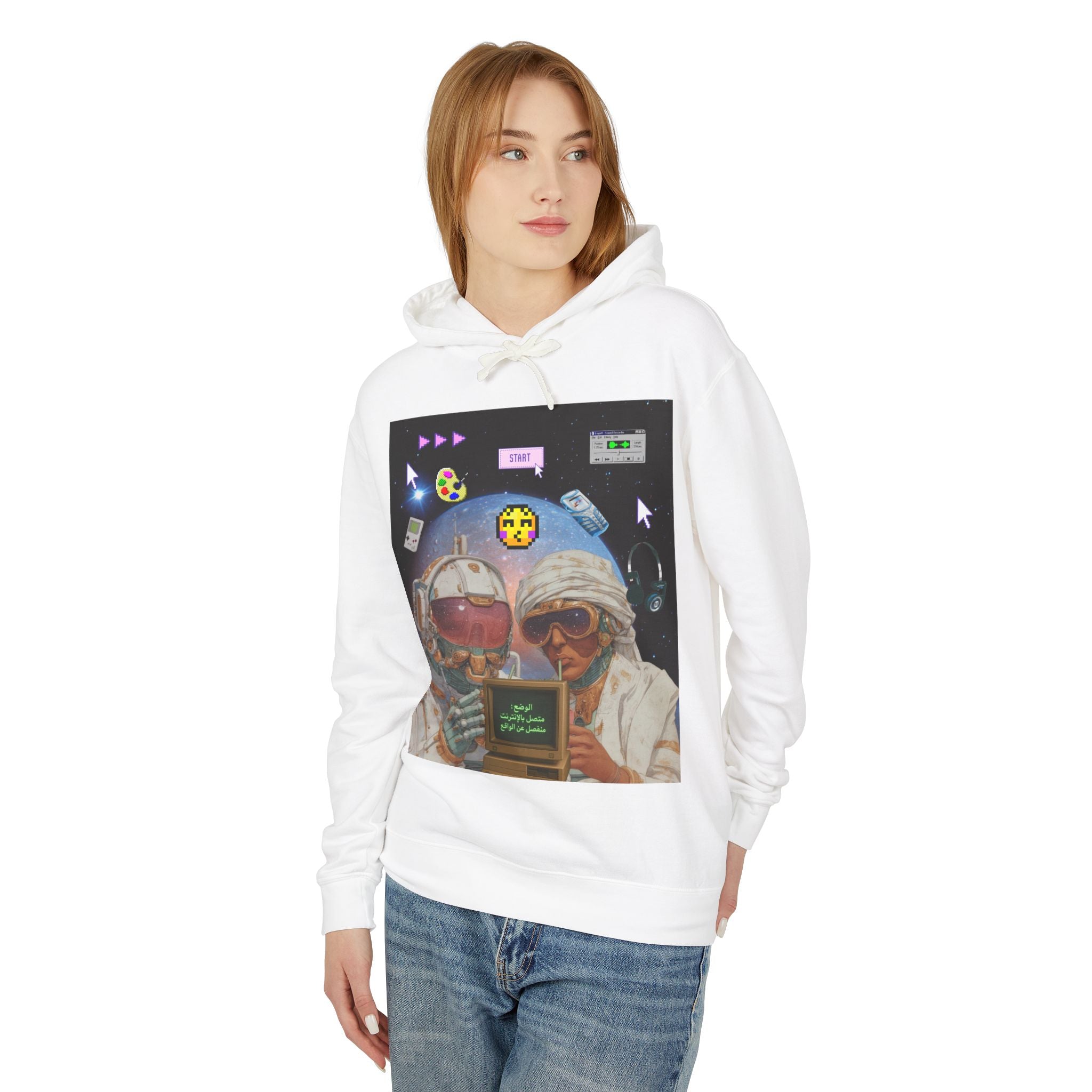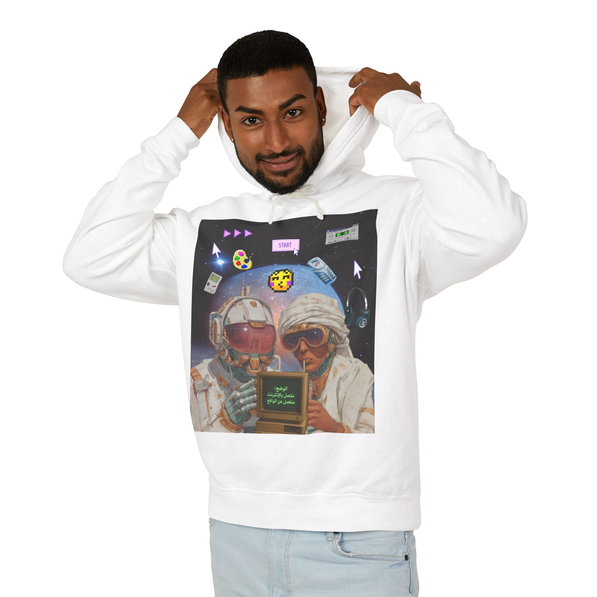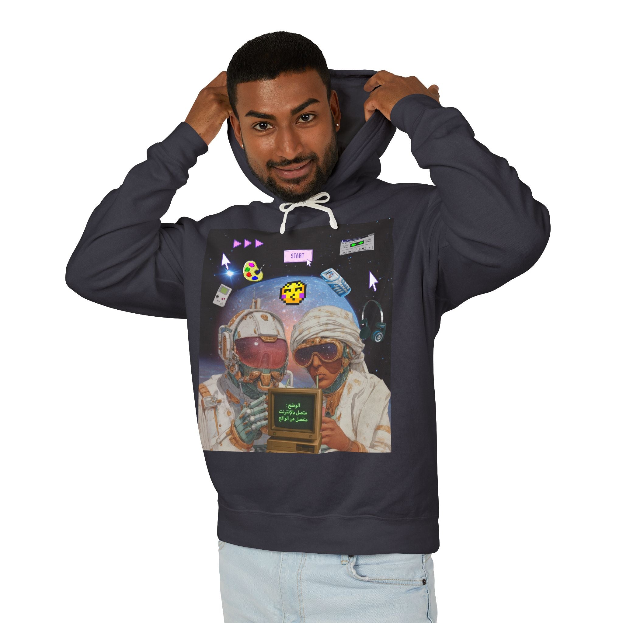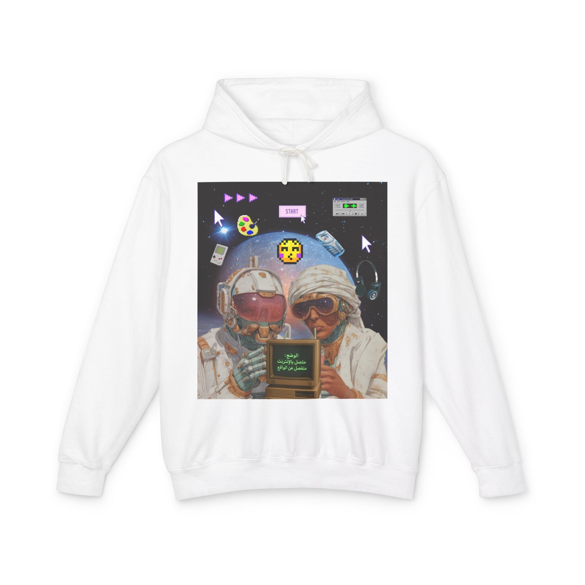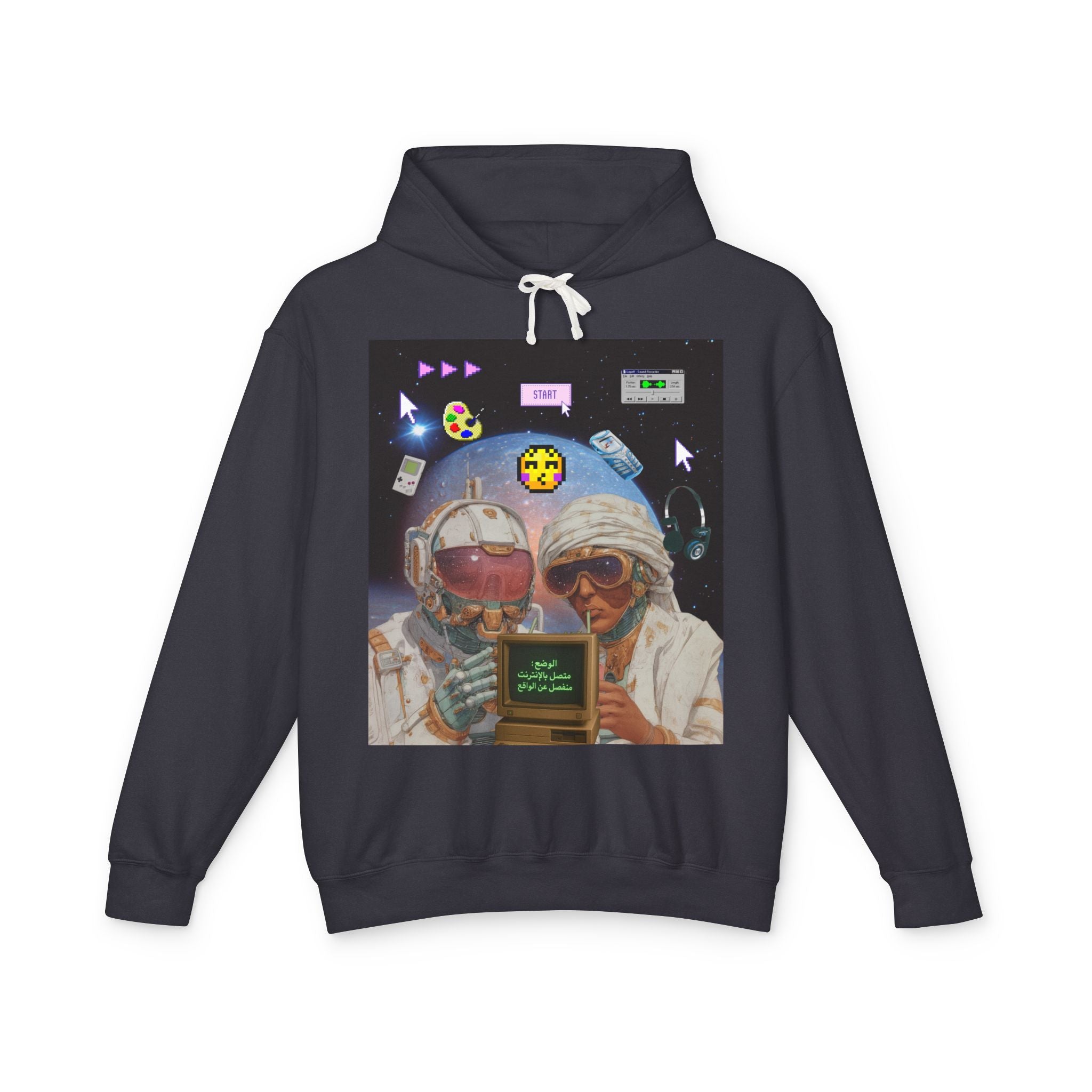 This hoodie is an ode to our generation: raised on dial-up dreams, trapped in the cloud, and still pretending to be “fine.” The Arabic text translates to “Status: Connected to the Internet, Disconnected from Reality” — a confession disguised as fashion.