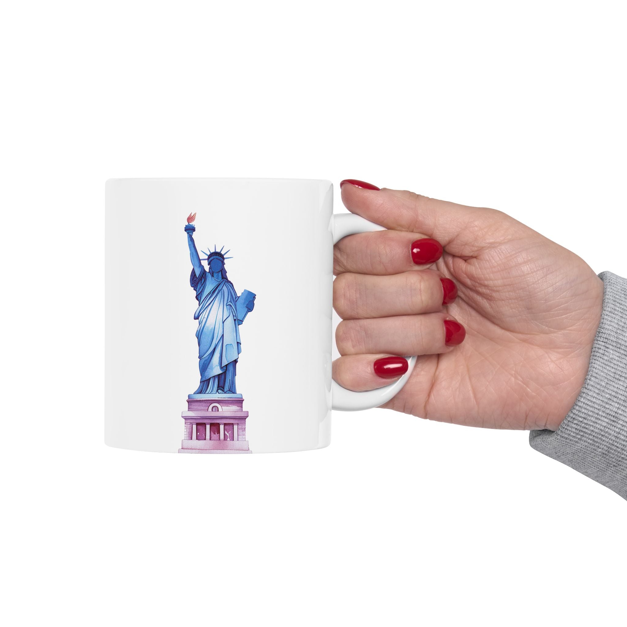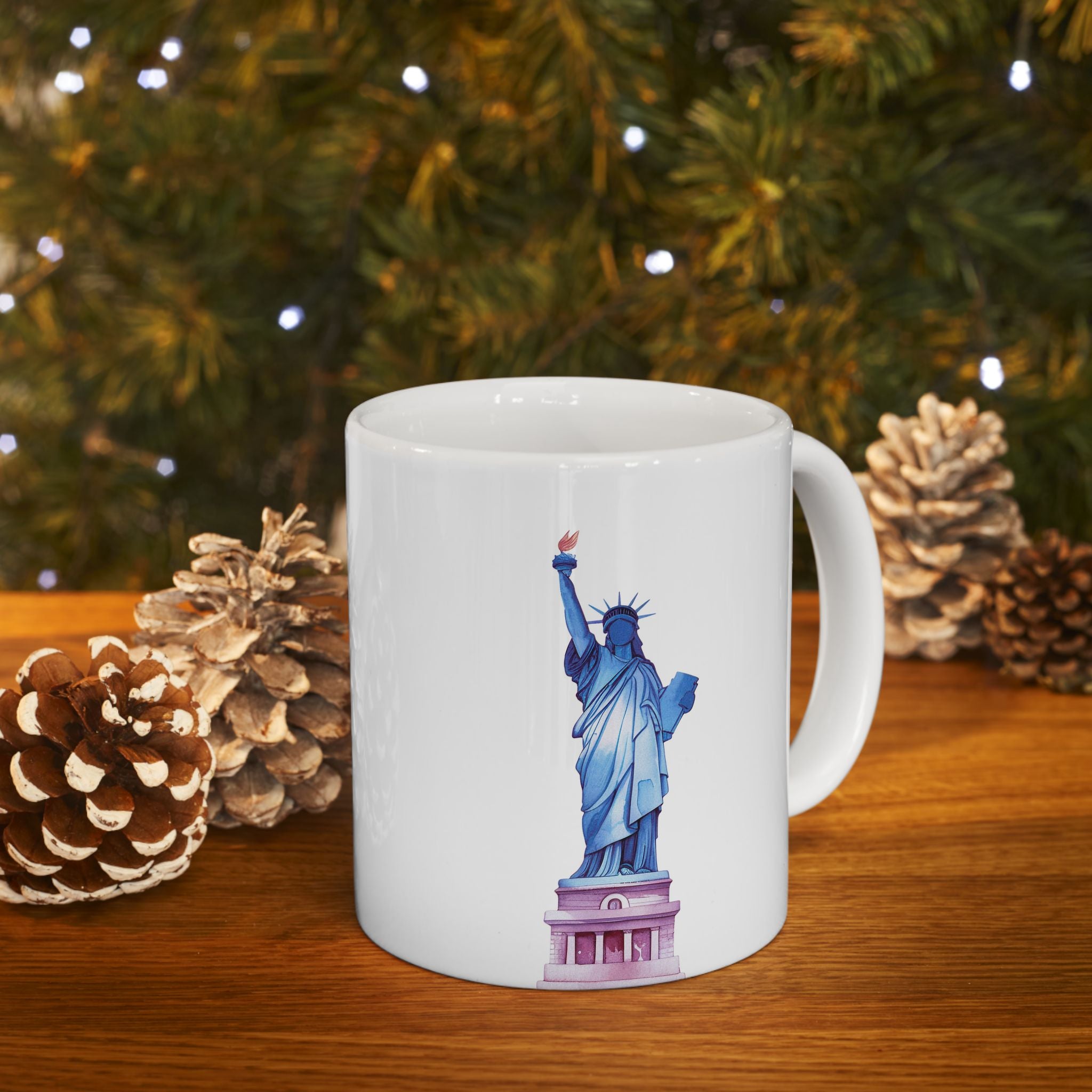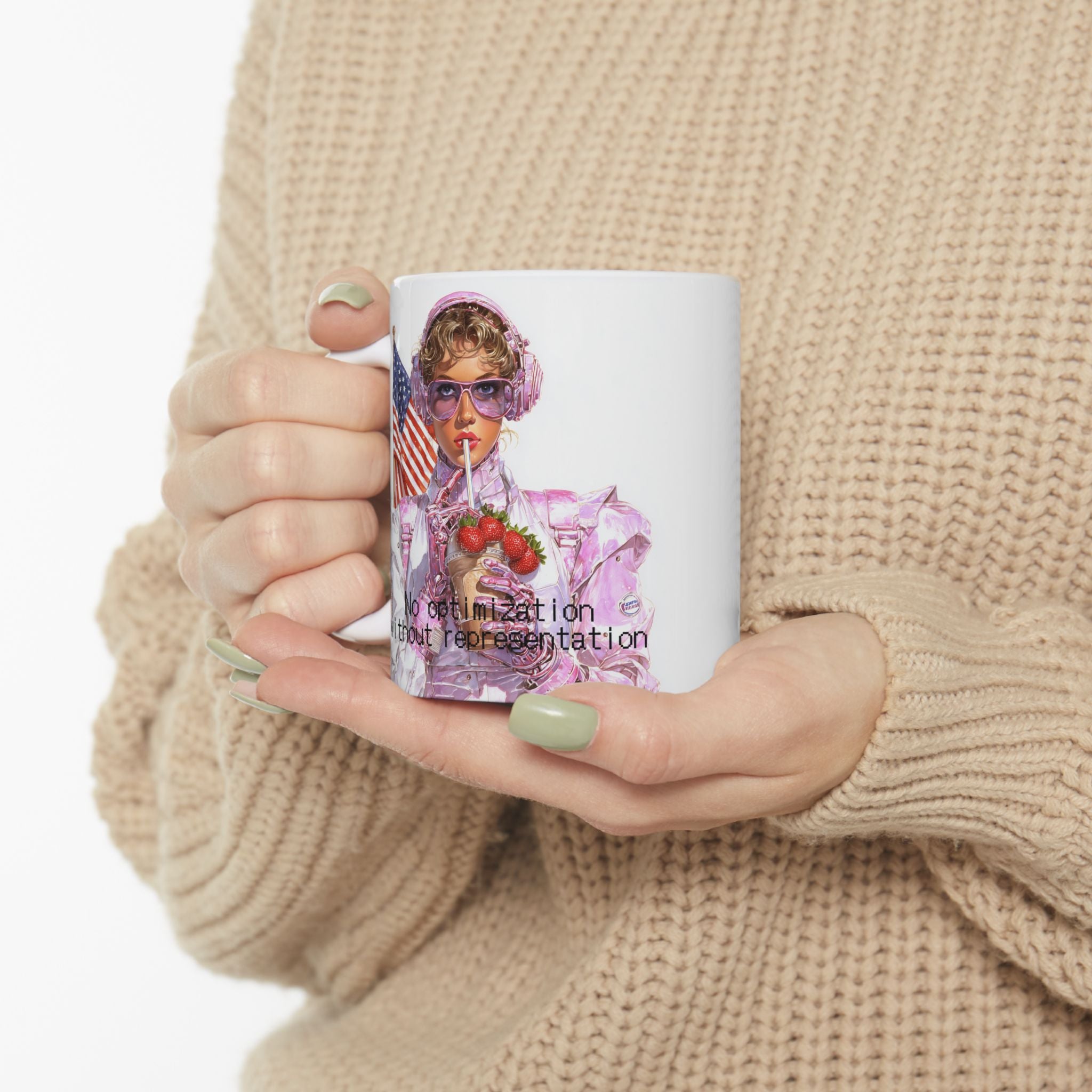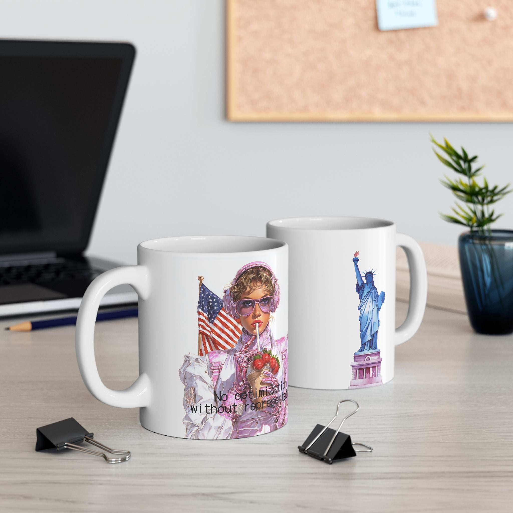 This 11oz mug is less about coffee and more about critique — a porcelain protest against the algorithmic empire. Durable white ceramic, shiny finish, and a comfortable C-handle make it practical; the imagery makes it prophecy.
