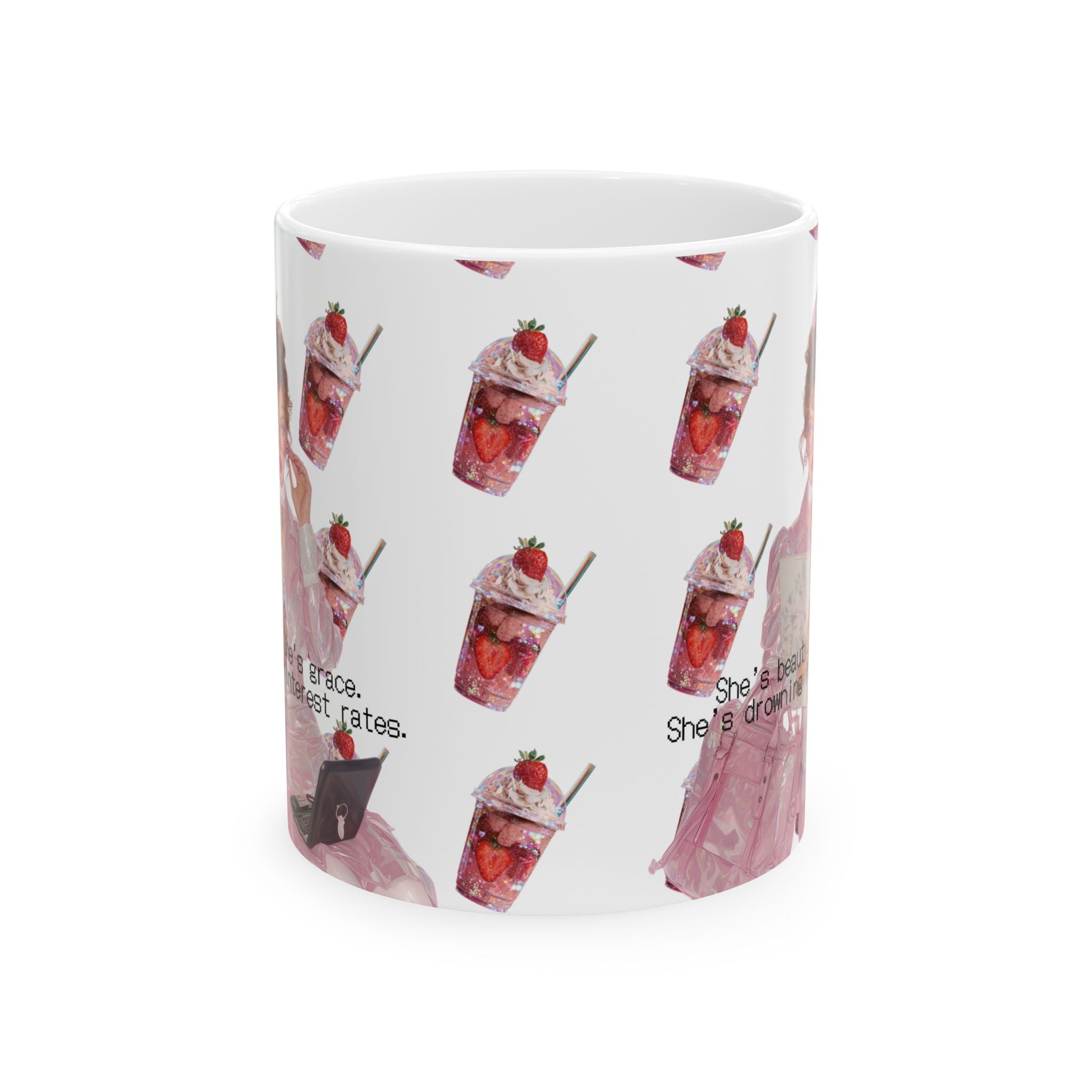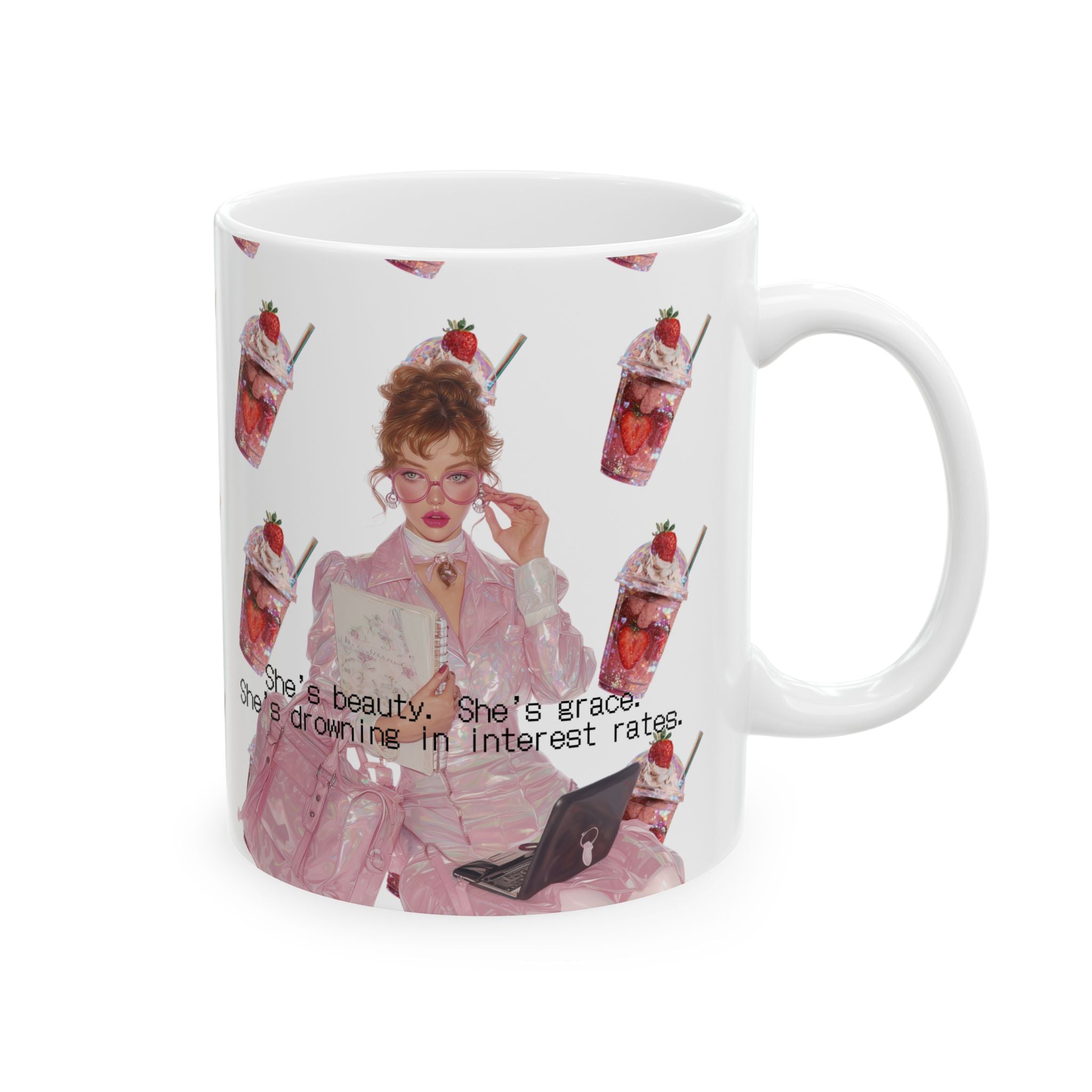 This mug isn’t just a vessel for caffeine — it’s a dissertation on late capitalism disguised as pastel kitsch. Between the strawberry milkshake aesthetic and the crushing awareness of adjustable APRs, you’ll find the perfect balance of cute and catastrophic.