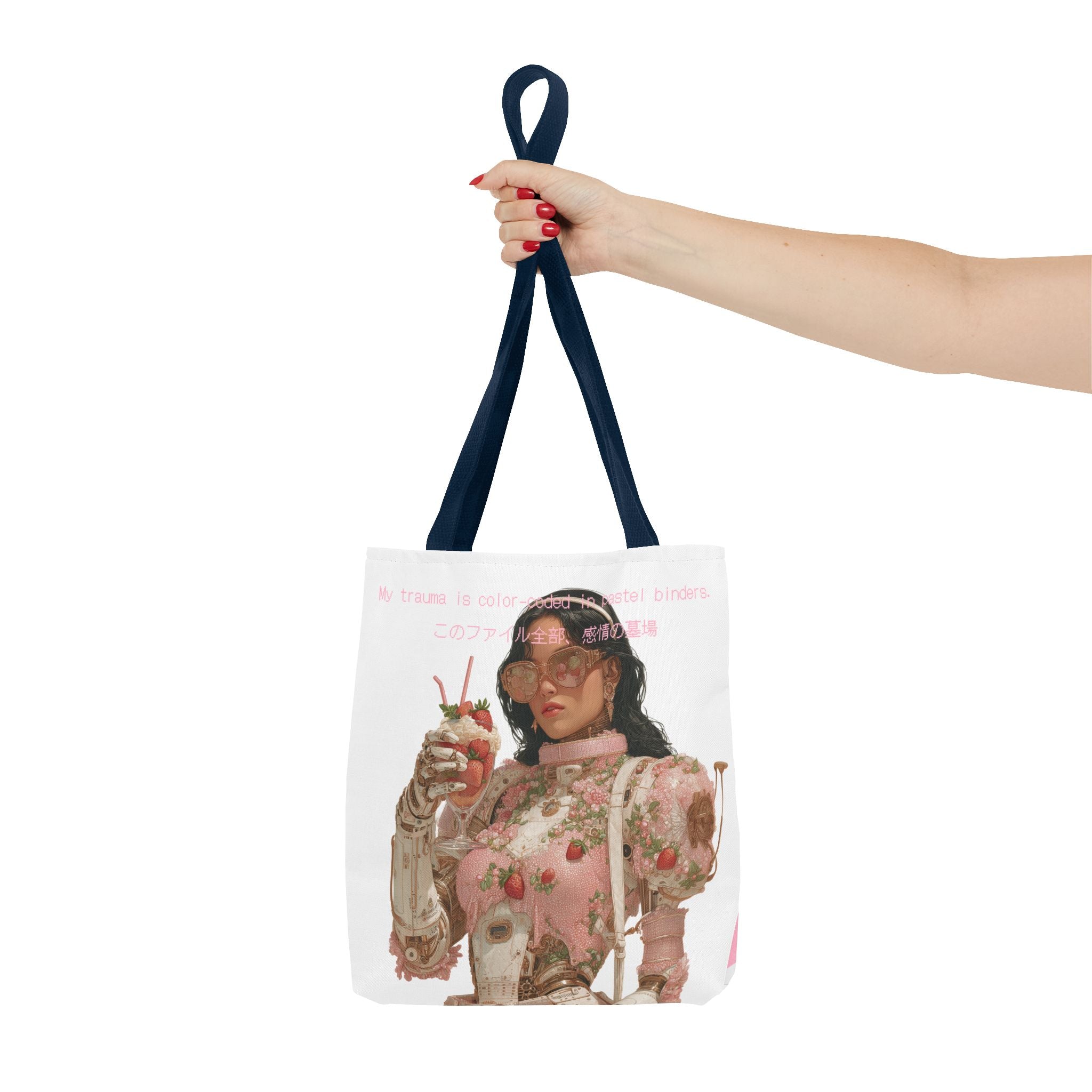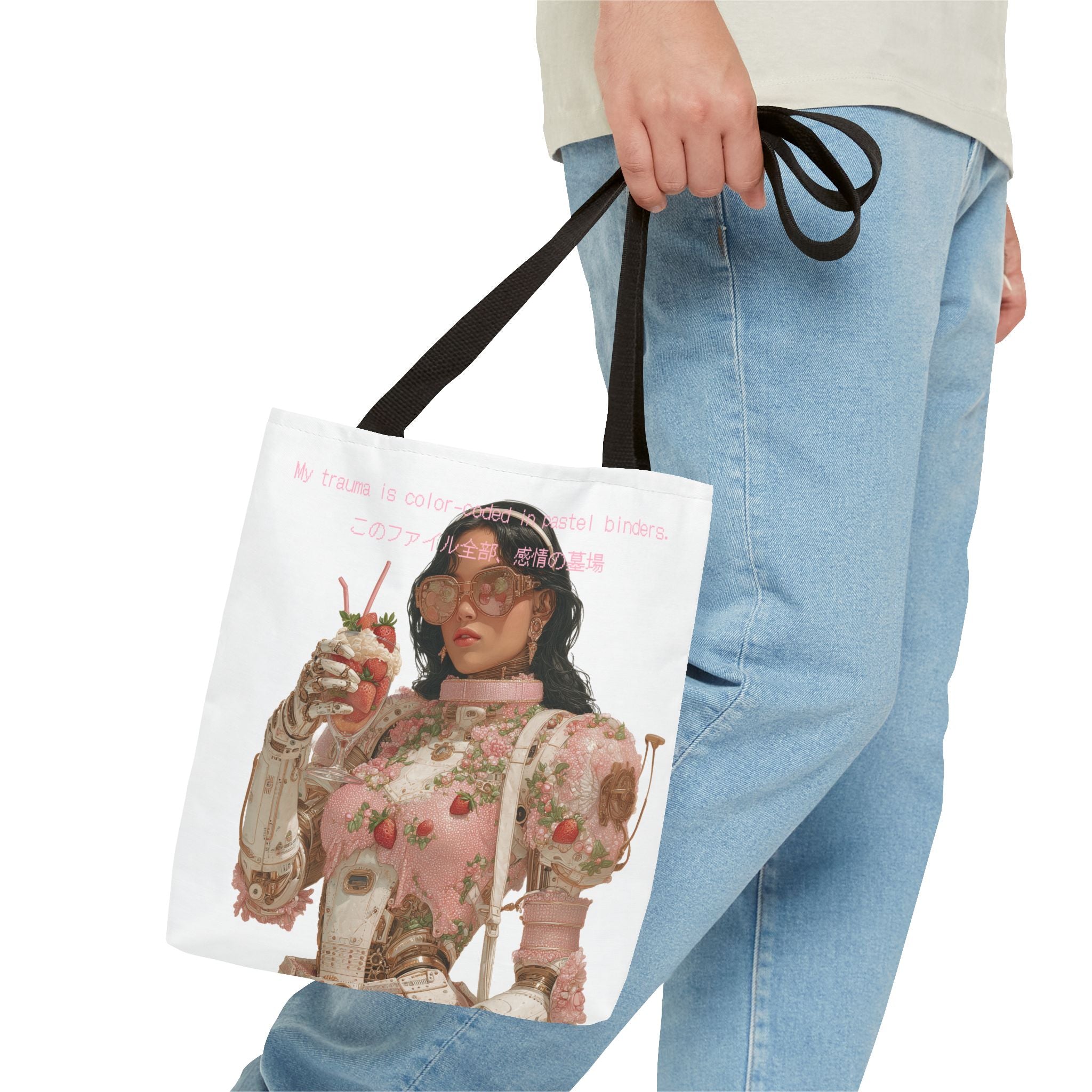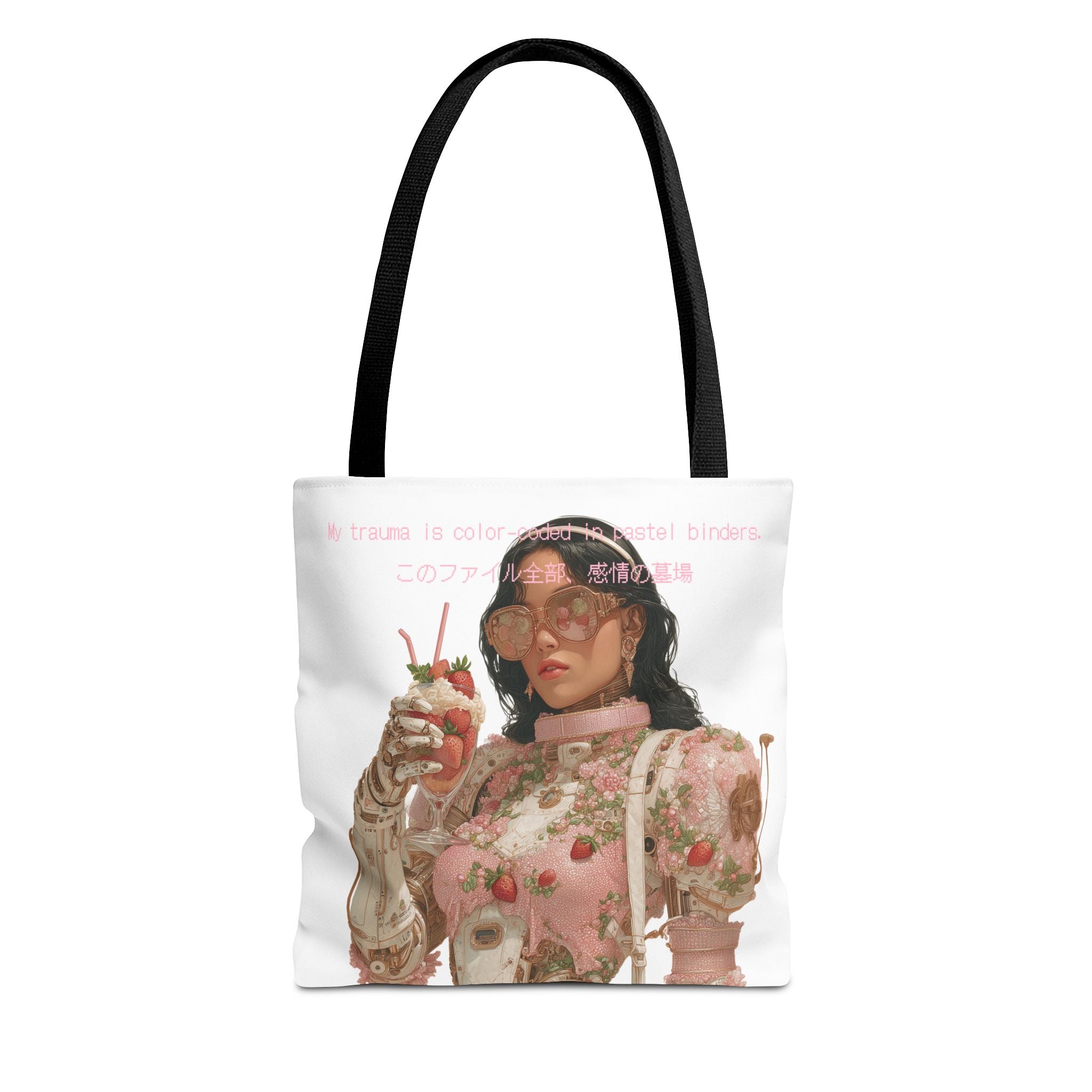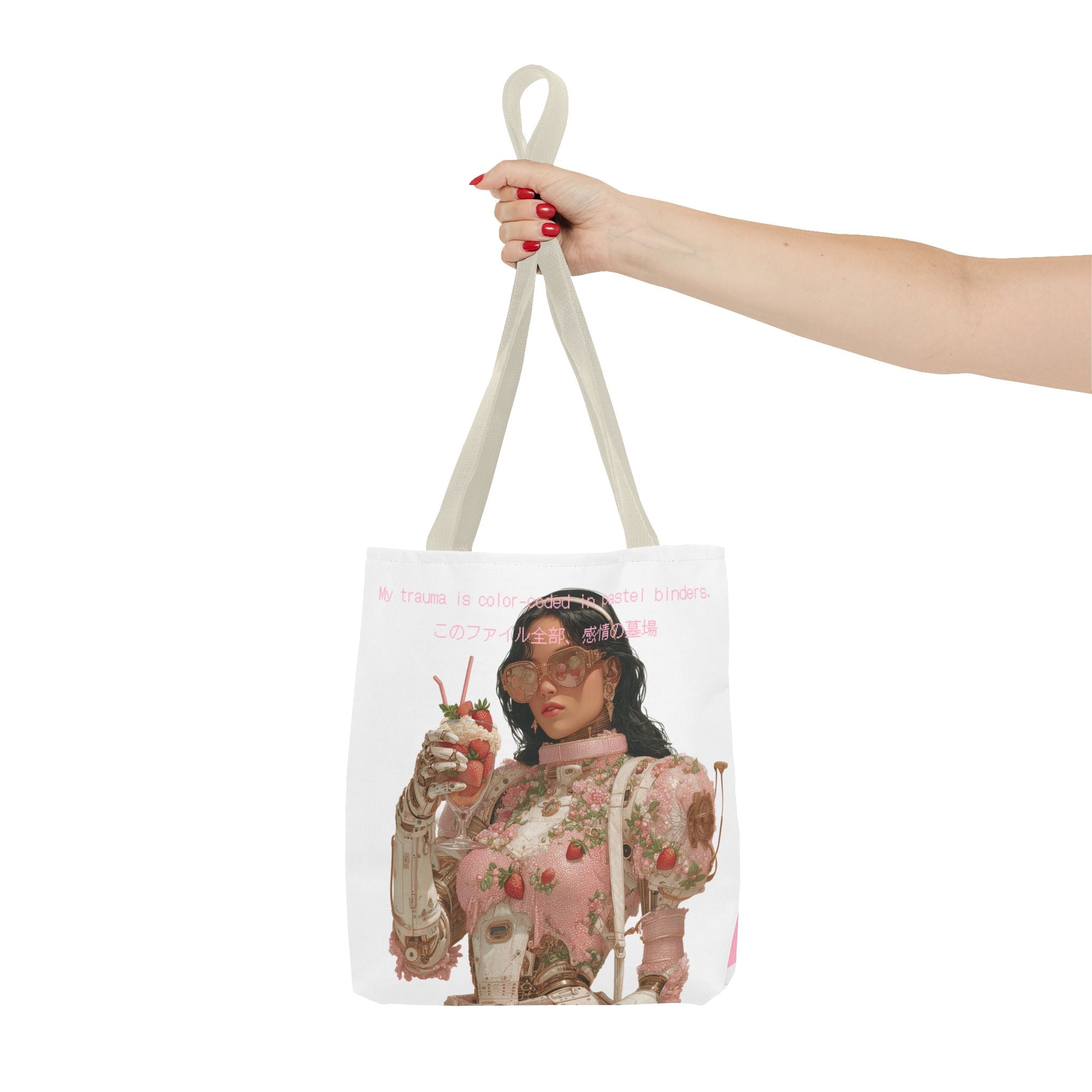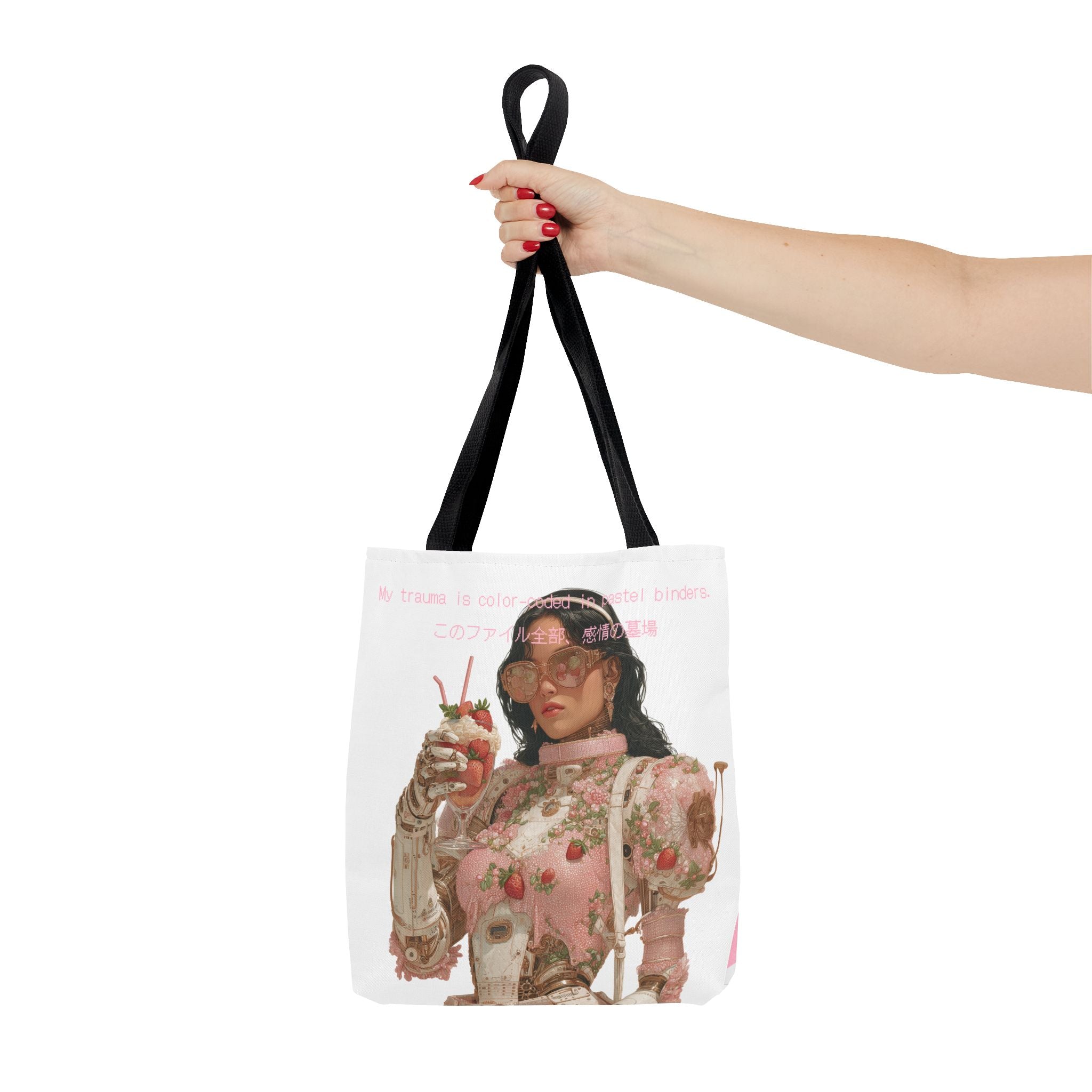 For the ones who archive their emotions in shades of blush and static — this tote is a love letter to melancholy dressed in pink. A perfect fusion of soft-girl dreams and cybernetic decay, it carries everything from your journal to your dissociation with quiet elegance.