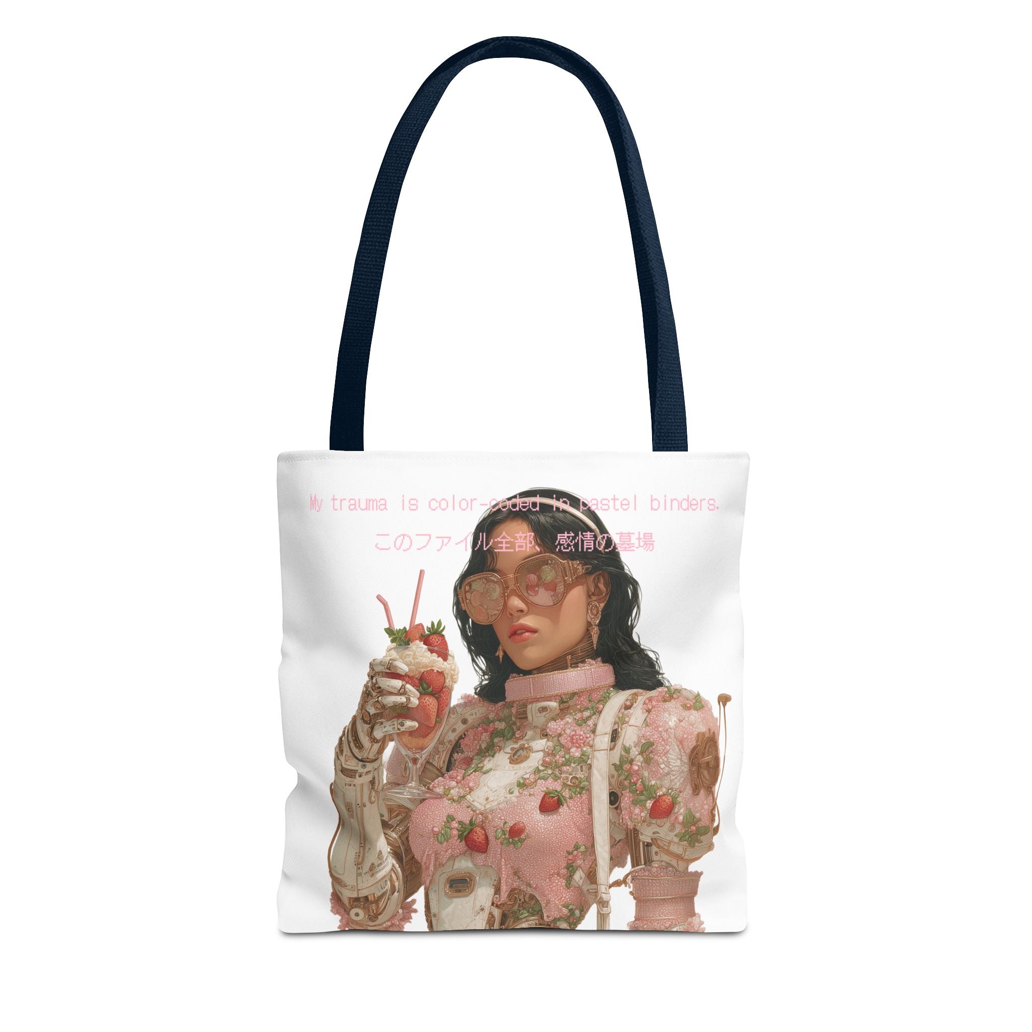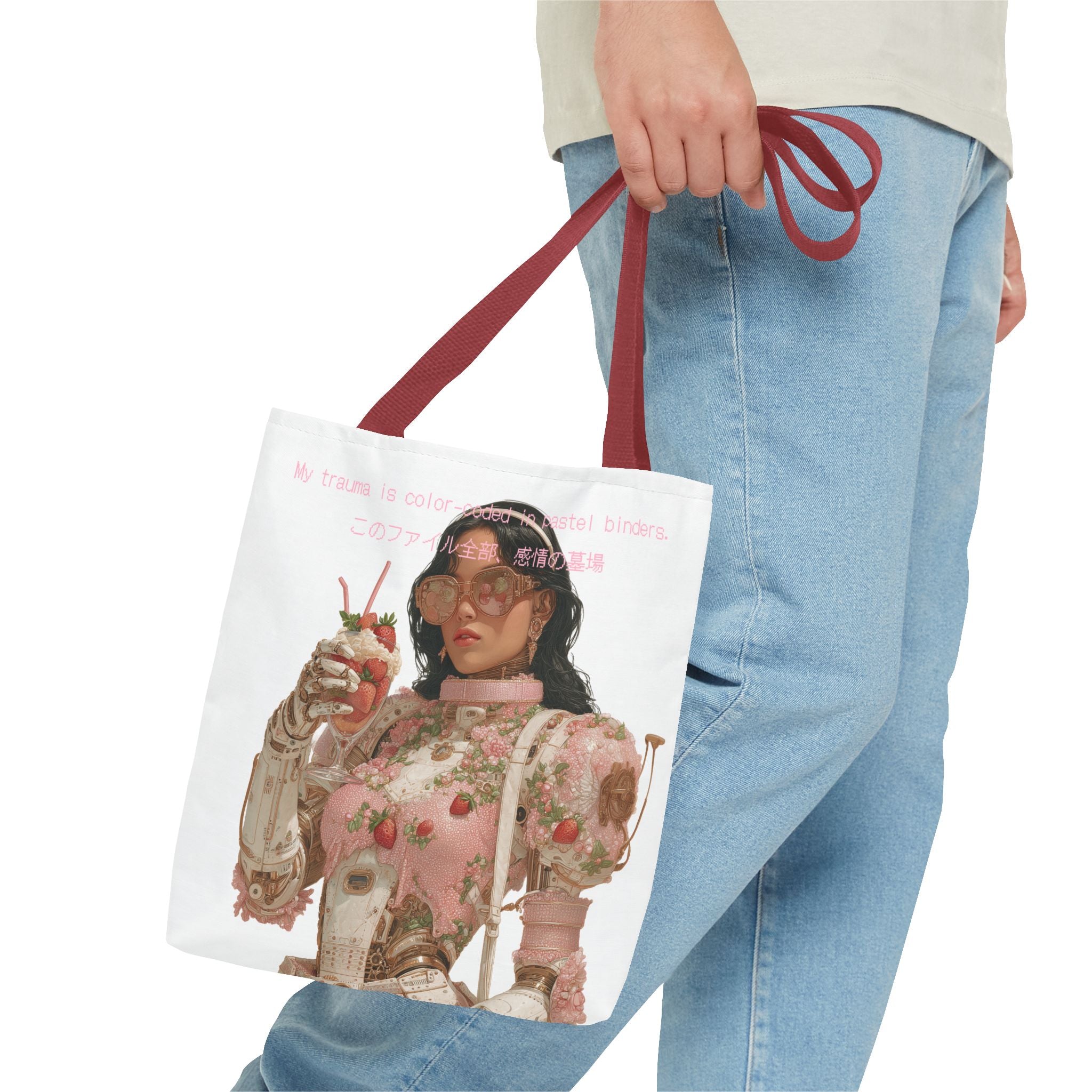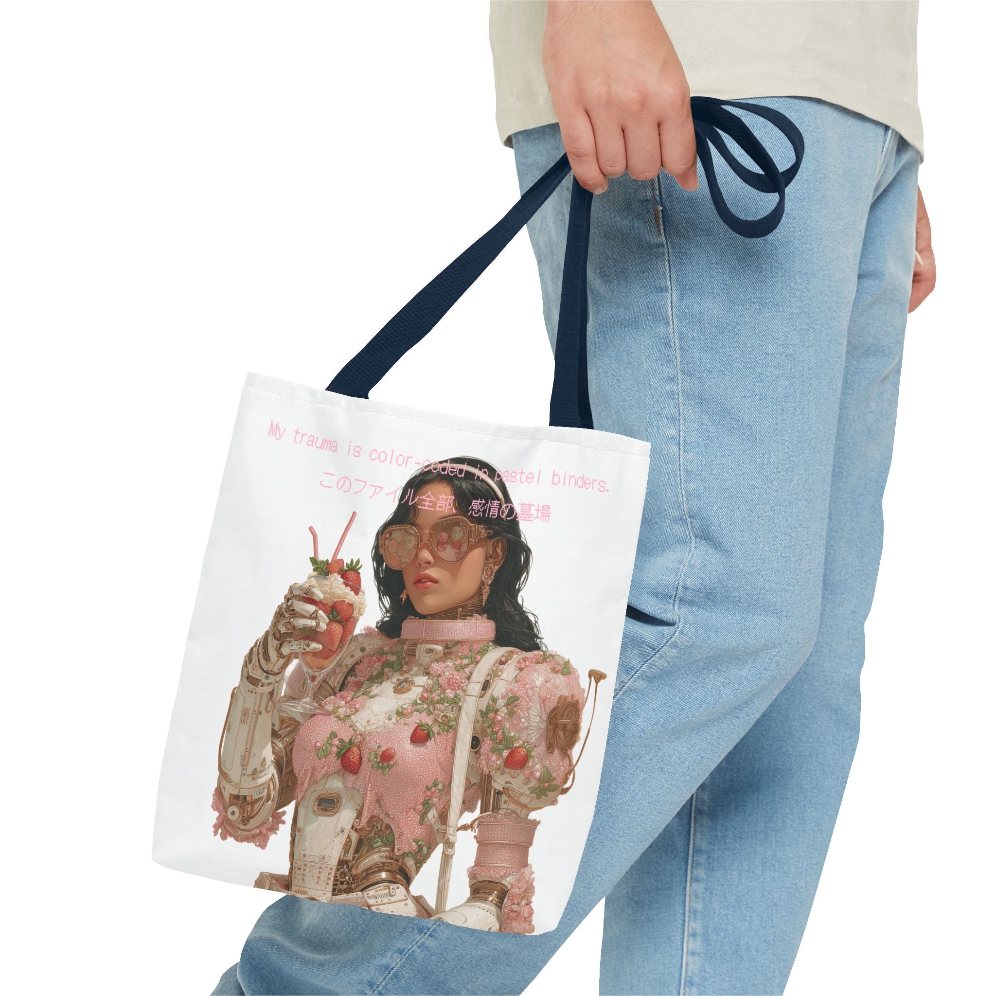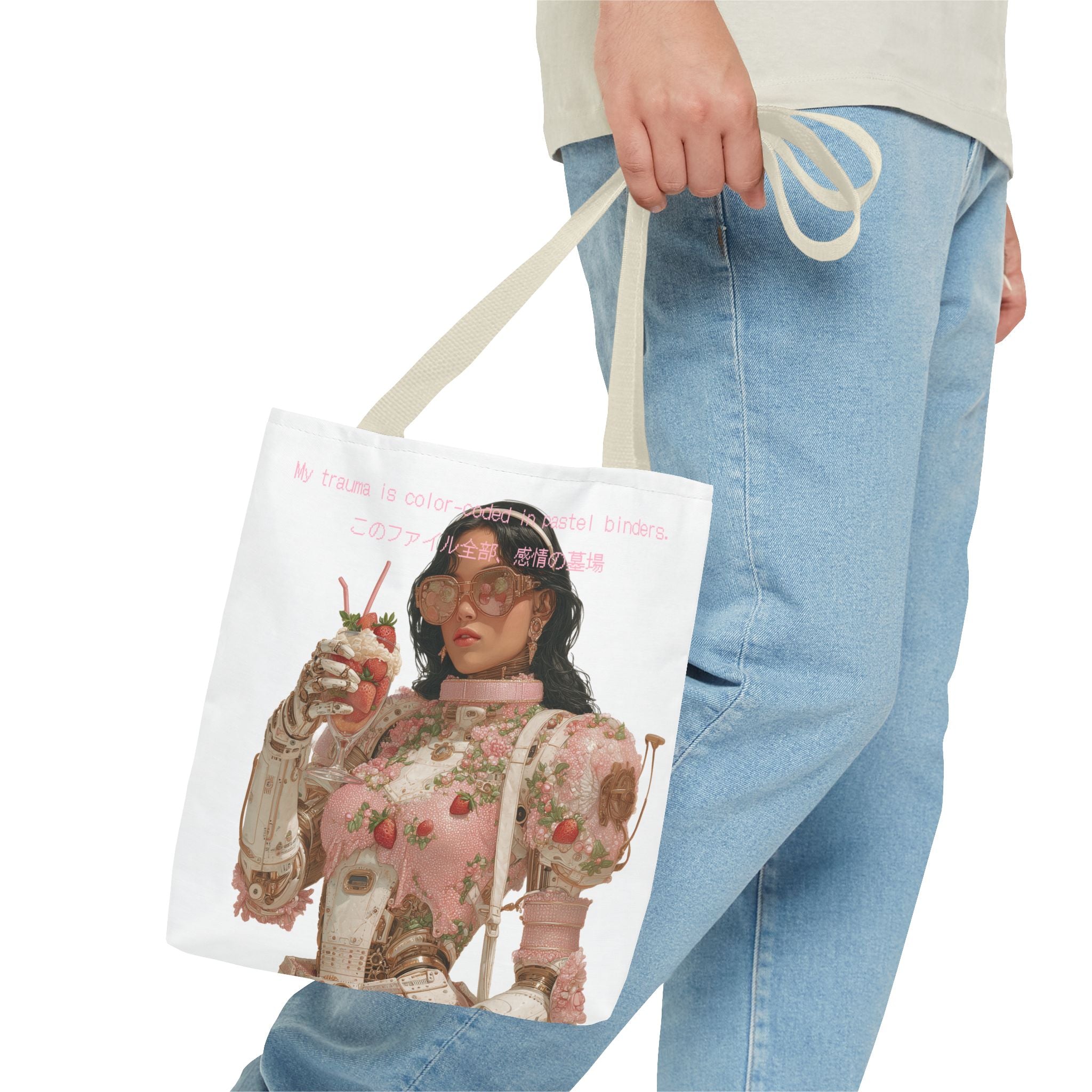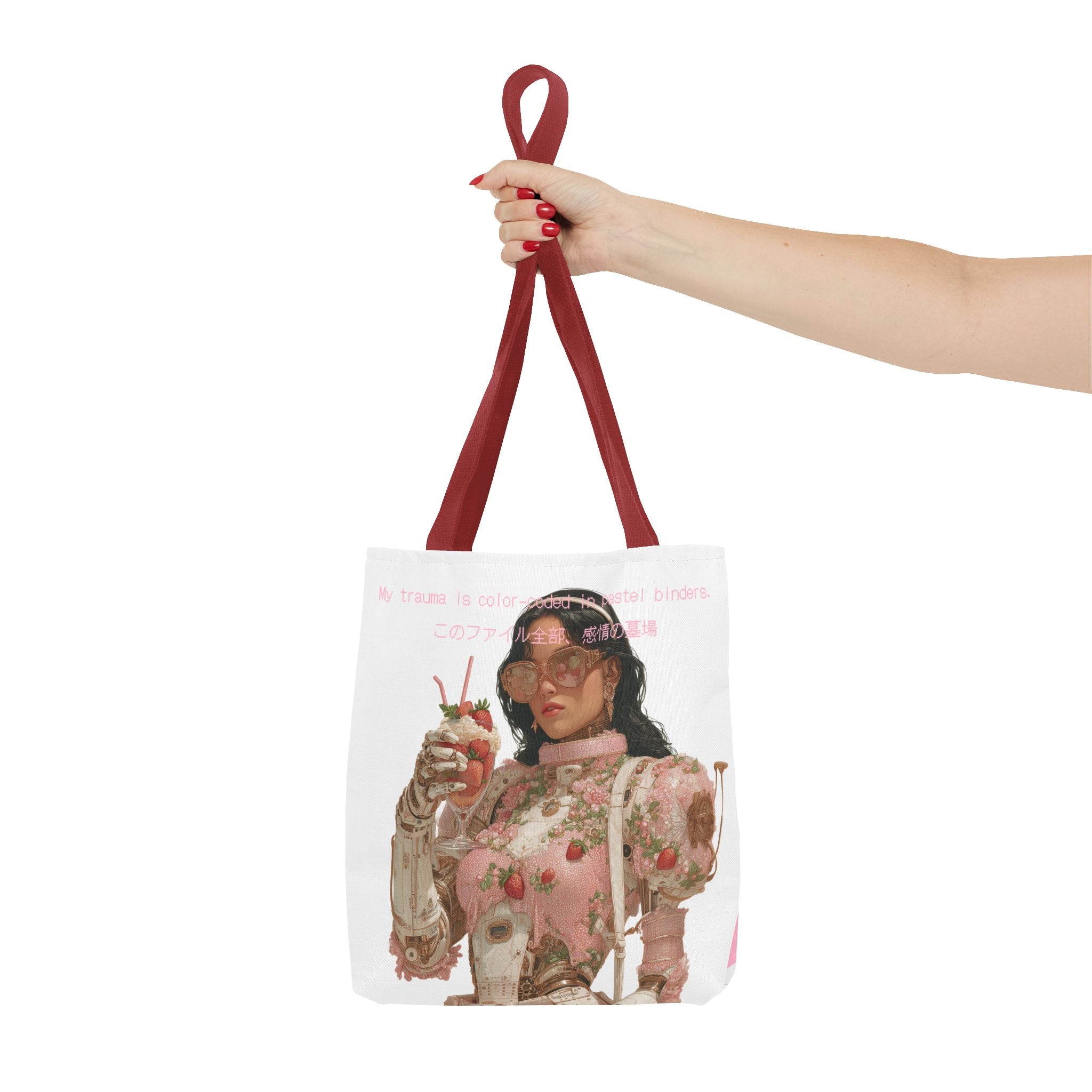For the ones who archive their emotions in shades of blush and static — this tote is a love letter to melancholy dressed in pink. A perfect fusion of soft-girl dreams and cybernetic decay, it carries everything from your journal to your dissociation with quiet elegance.
